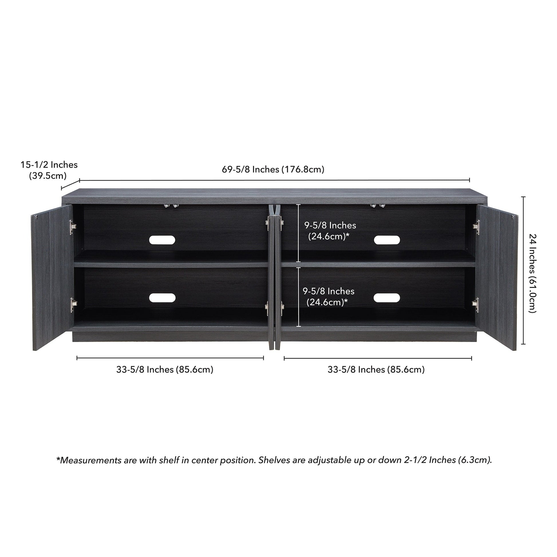 On-trend texture and design combine in this transitional TV stand. With a wood grain finish and textured doors, this piece is sure to be a statement in your living room, den, or game room. The plinth base gives an illusion of a seamless transition from your floor, as if it was always meant to be there. The modern contemporary design of the stand features 4 fully enclosed doors with 4 inner shelves, allowing for ample storage for your devices, games, books, and more.