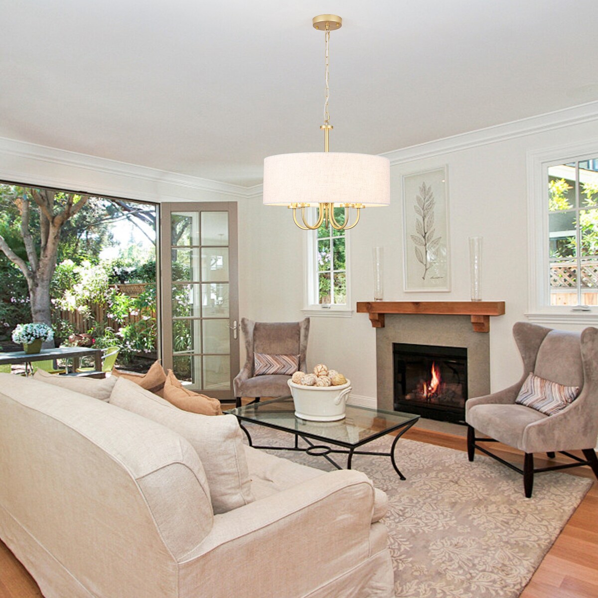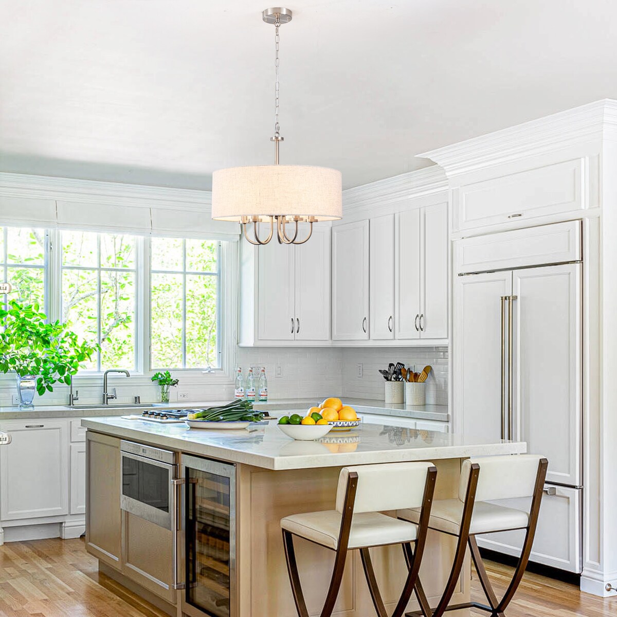 Featured by a linen drum shaped lamp-shade, this modern chandelier showcases coastal style design elements. This farmhouse pendant light is made of metal and linen lampshades, and the contrast between the color and texture of the lampshade and metal products creates visual fun. This look is perfect for coastal getaways, relaxed loft spaces, and rustic cottages. After installation, it can accommodate five candlestick bulbs up to 60 W (bulbs not included), creating a candlelight aesthetic for your residence.