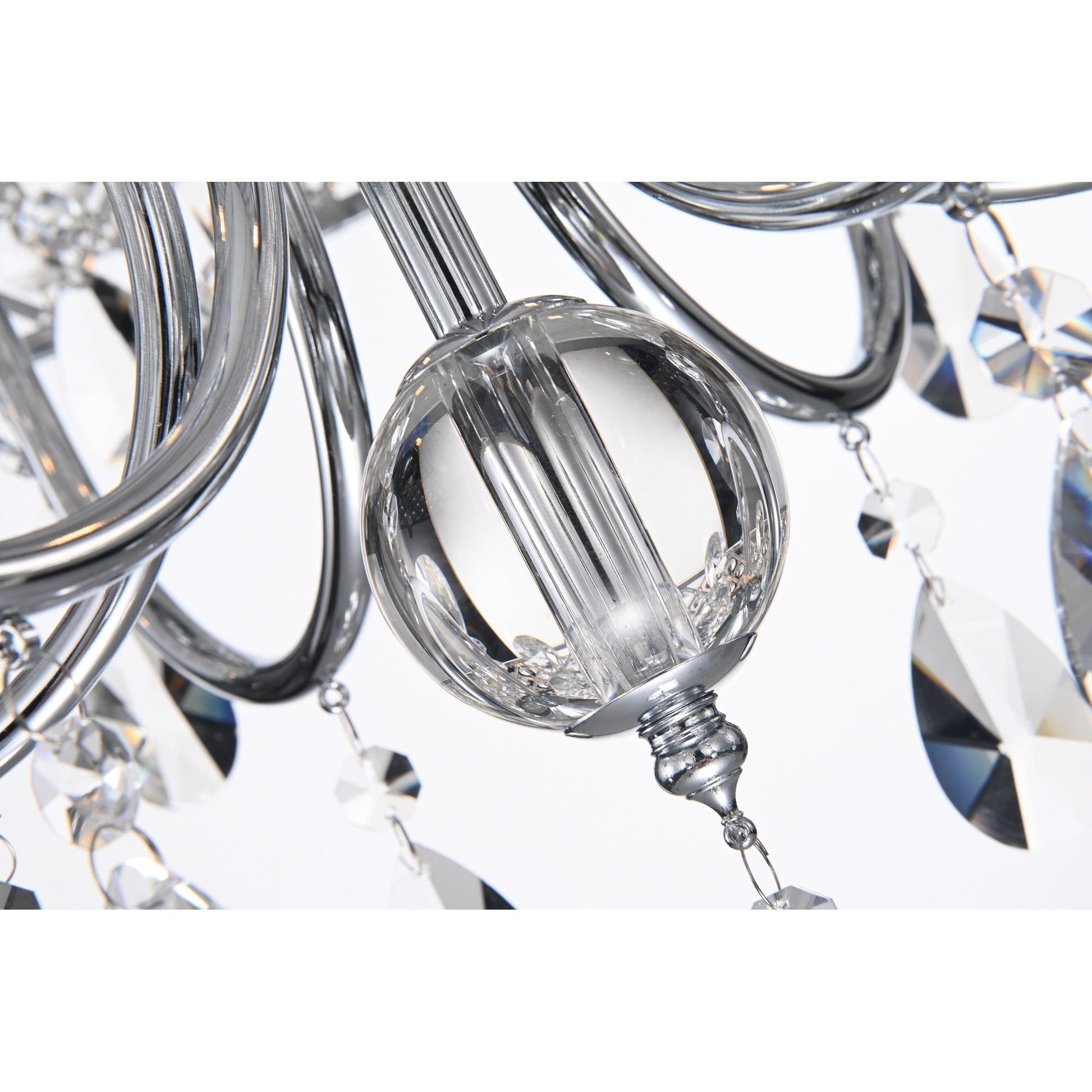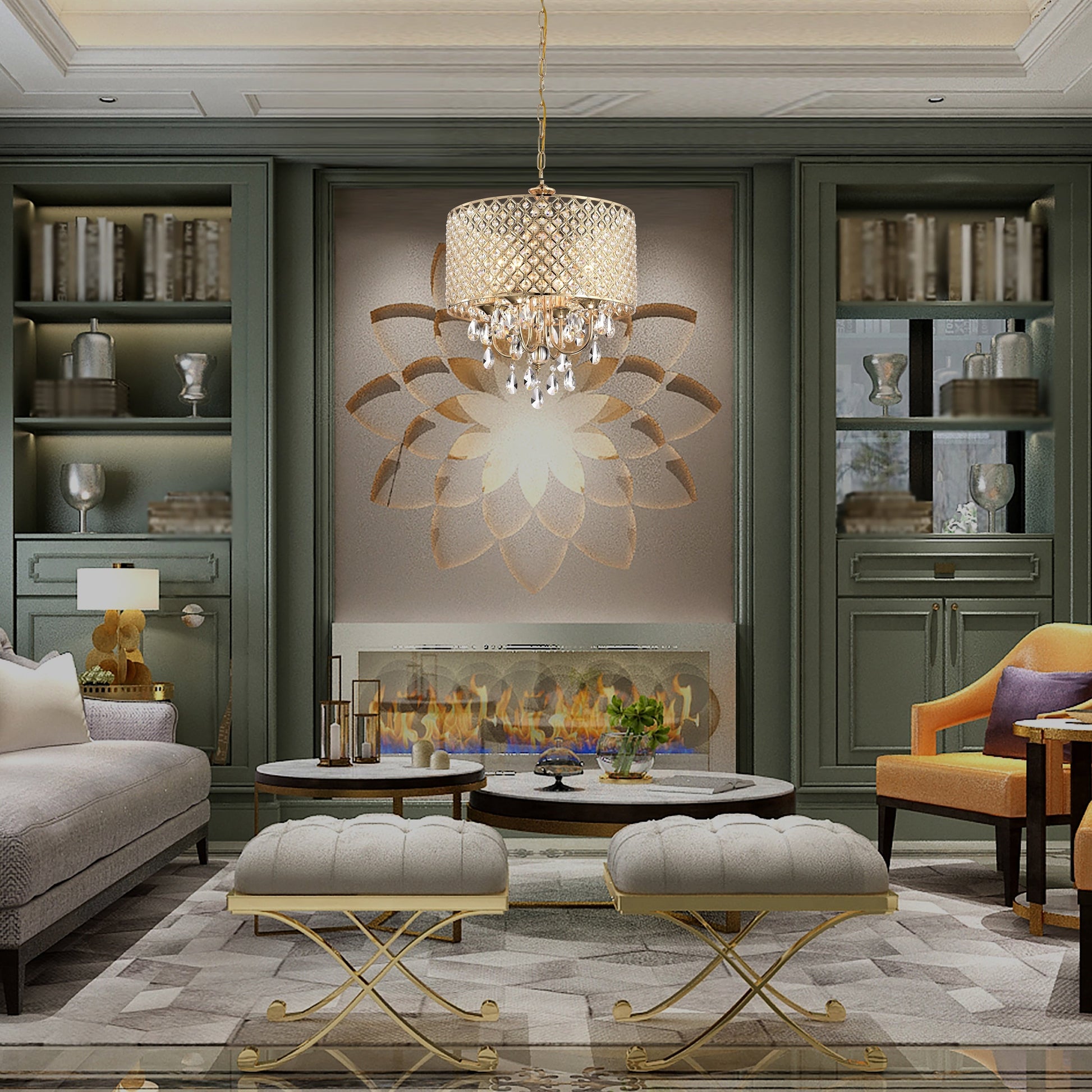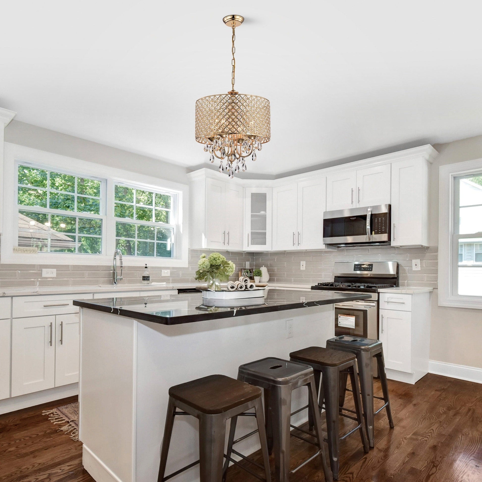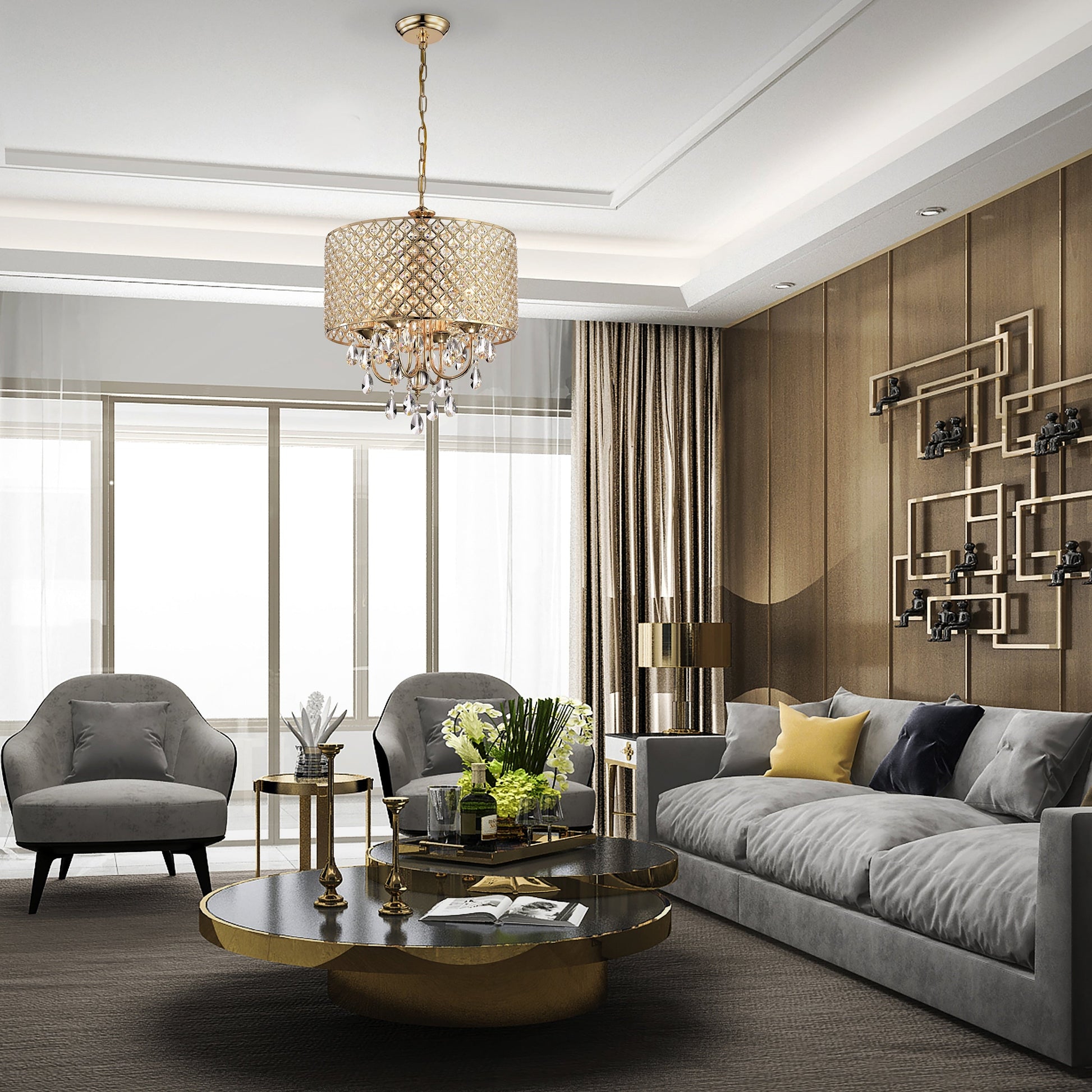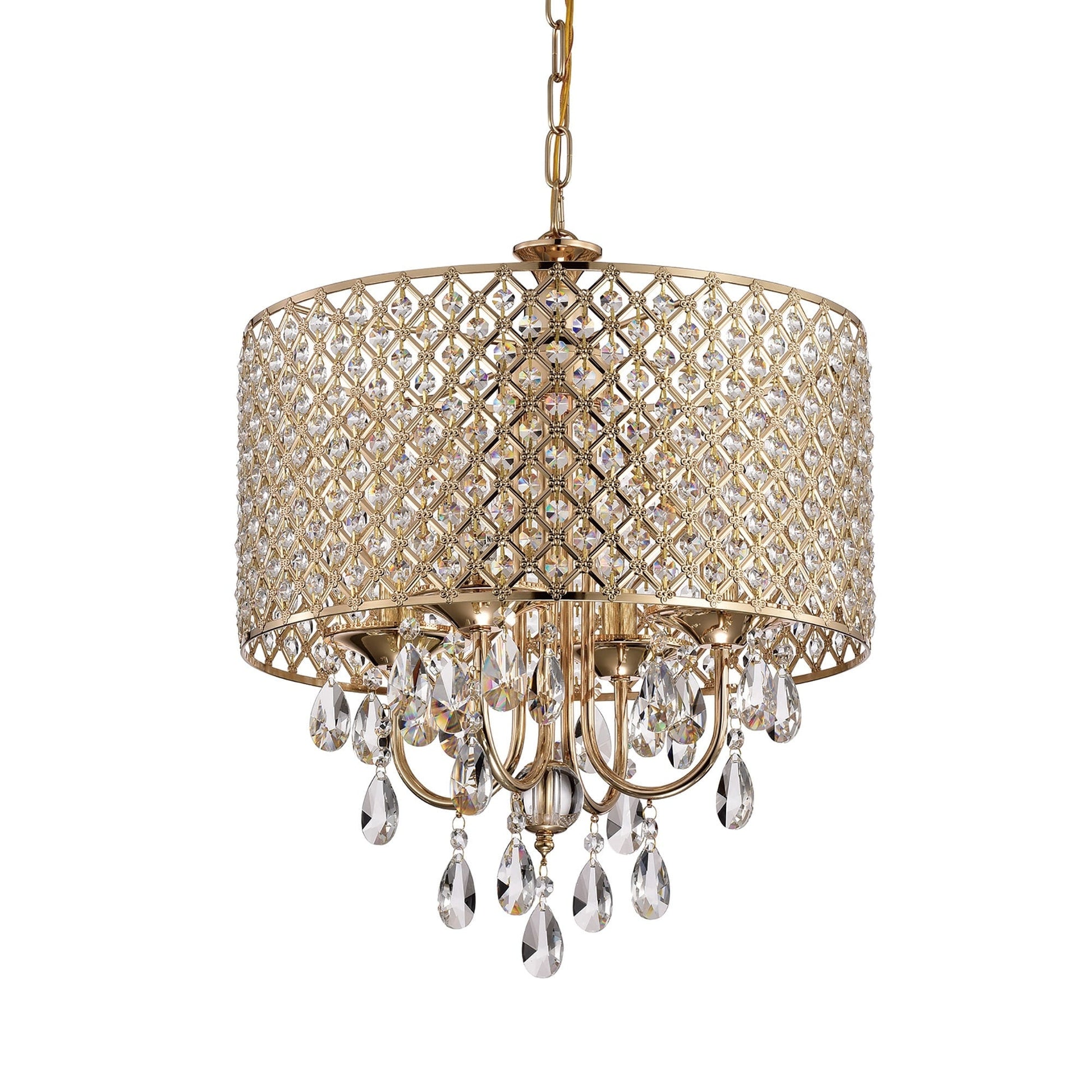 • 4-light chandelier: 17 in. Dia x 20 in. H with crystal hanging, Drum Dimensions: 17 in. Dia x 8.75 in. H