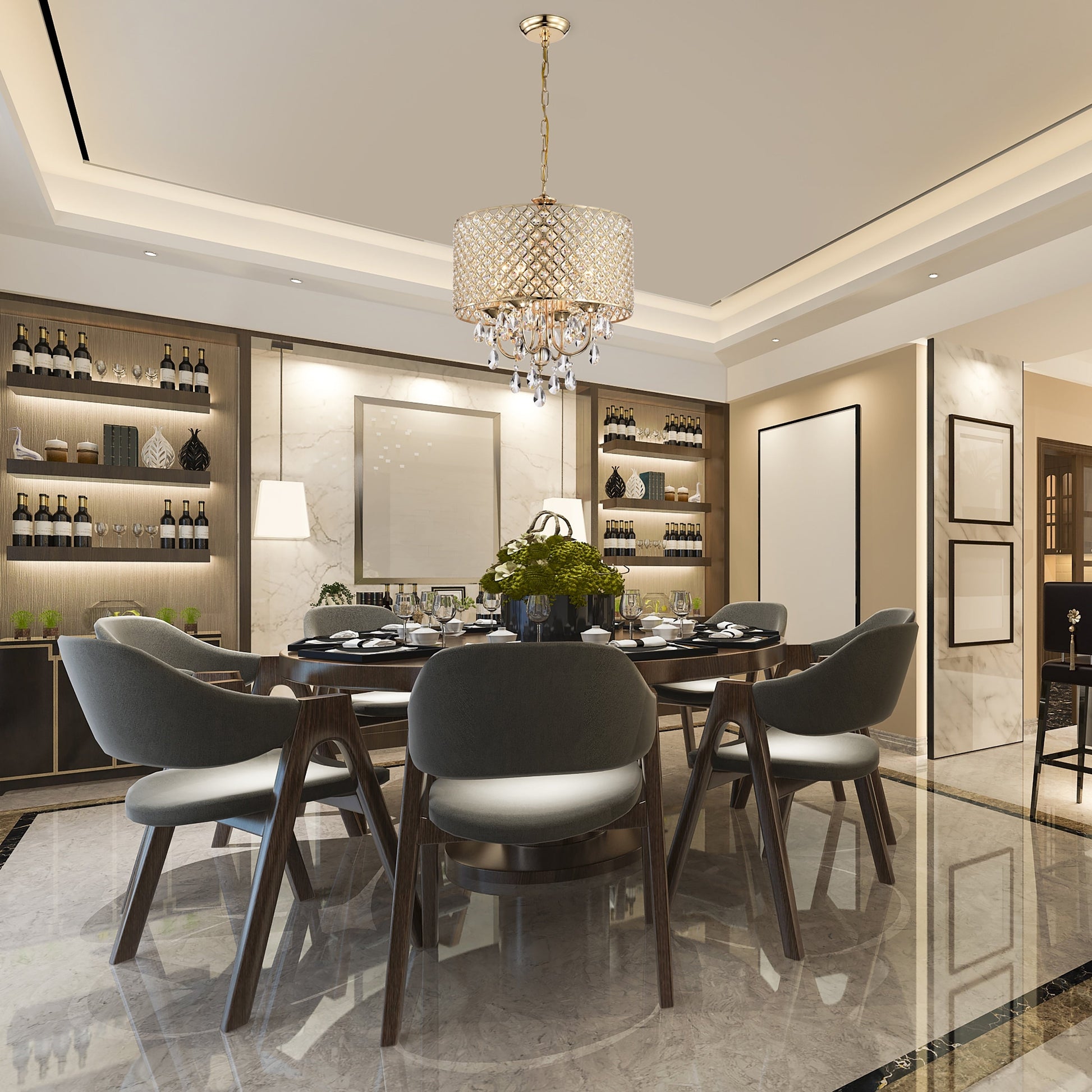 Round Beaded Drum Chandelier with Hanging Crystals