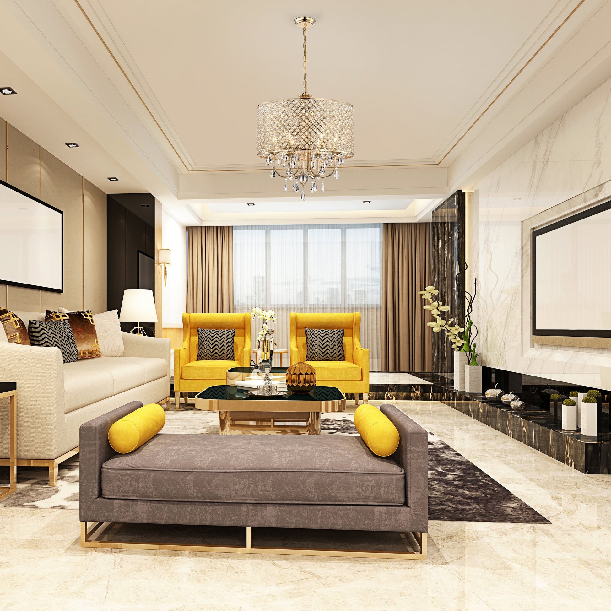 Add glamour and sophistication to your space with this Round Beaded Drum Chandelier featuring cascading crystals and a crystal-encrusted drum shade. The elegant gold finish adds a touch of luxury to any room. The chandelier comes in both four-light and six-light options and has an adjustable chain length of 40 inches, making it perfect for different ceiling heights and room sizes. The upward-facing lights create an ambient glow, setting the mood for any occasion with a touch of drama and romance.