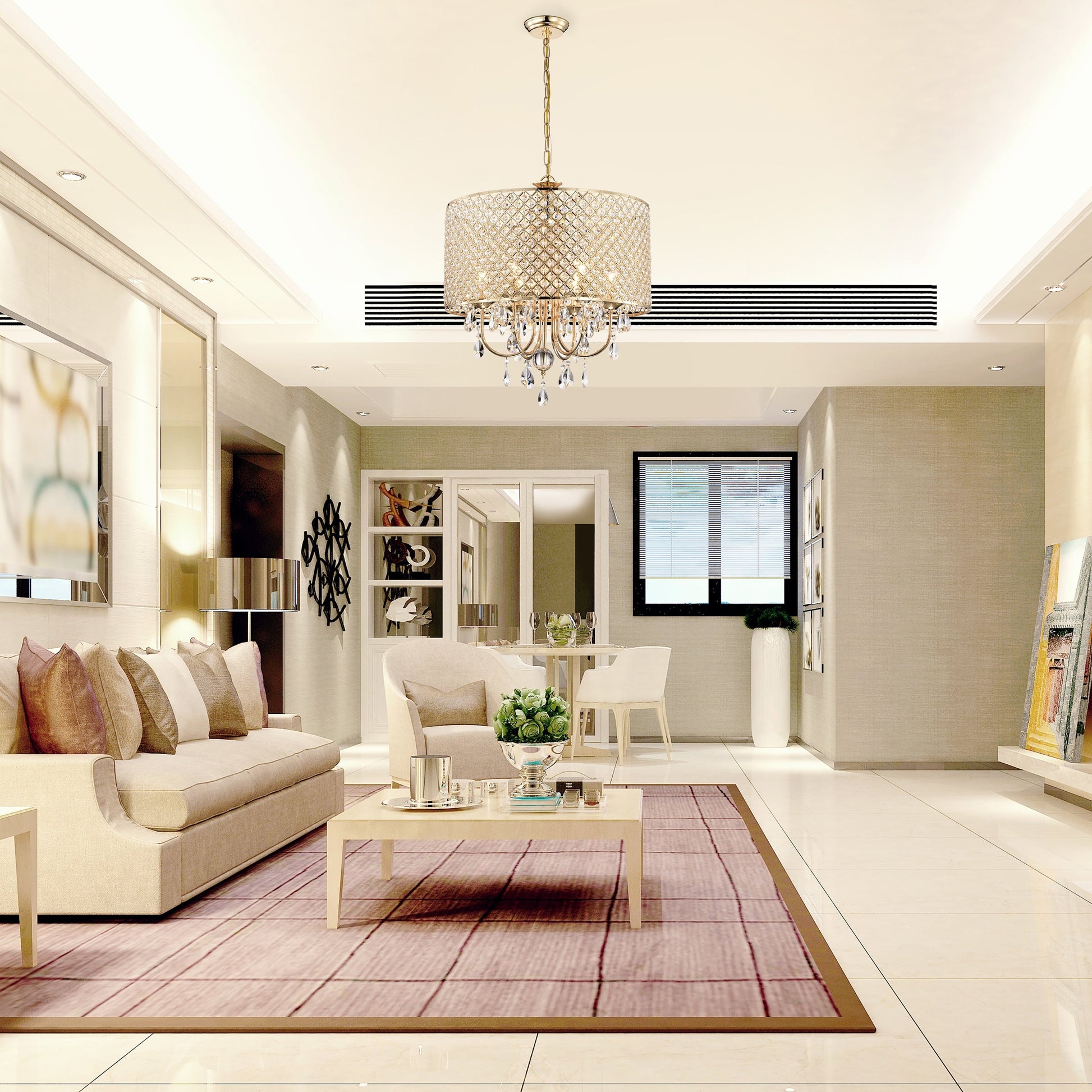 • 6-light chandelier: 22 in. Dia x 24 in. H with crystal hanging, Drum Dimensions: 22 in. Dia x 11 in. H