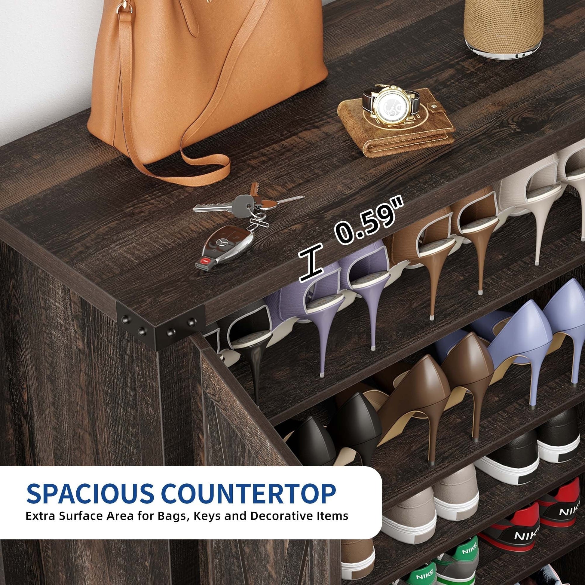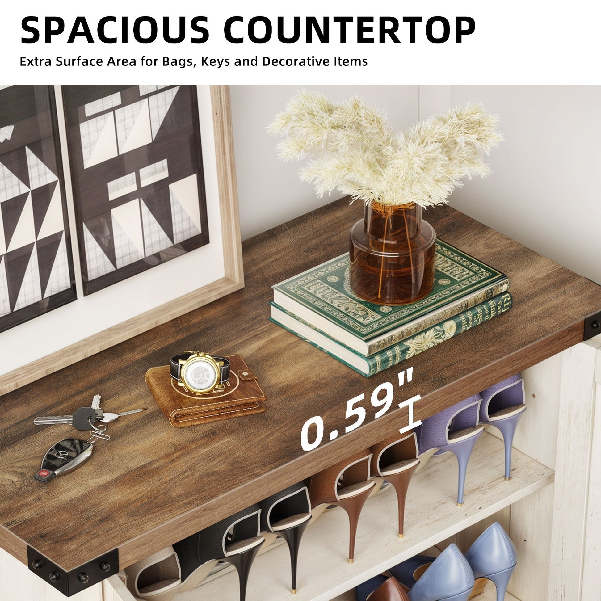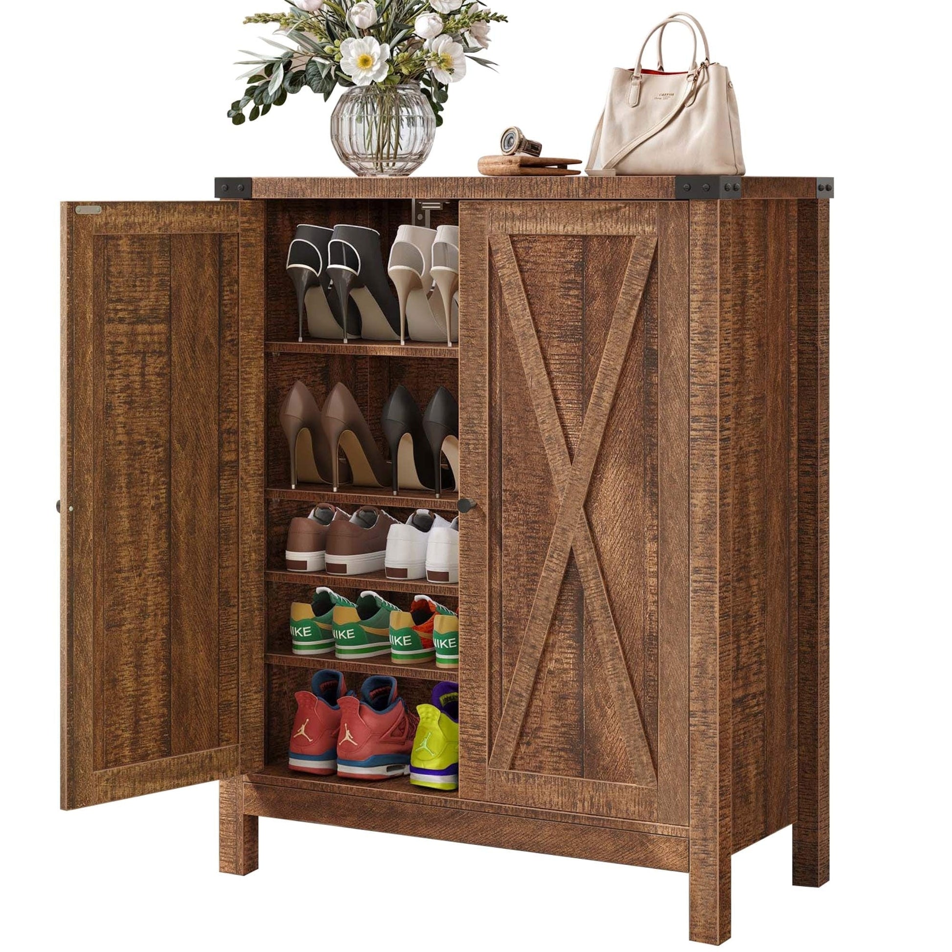 Step into organization with our spacious Shoe Cabinet. With 5 shelves that can accommodate 15-20 pairs of shoes, and a handy top for small items, it's a must-have for any home. The cabinet's exquisite X pattern adds a touch of farmhouse charm, while the adjustable 1st and 3rd shelves accommodate all types of footwear. Crafted from durable MDF with sturdy wooden legs, it's designed for stability and longevity. Remember to install the included anti-tip kit for safety.