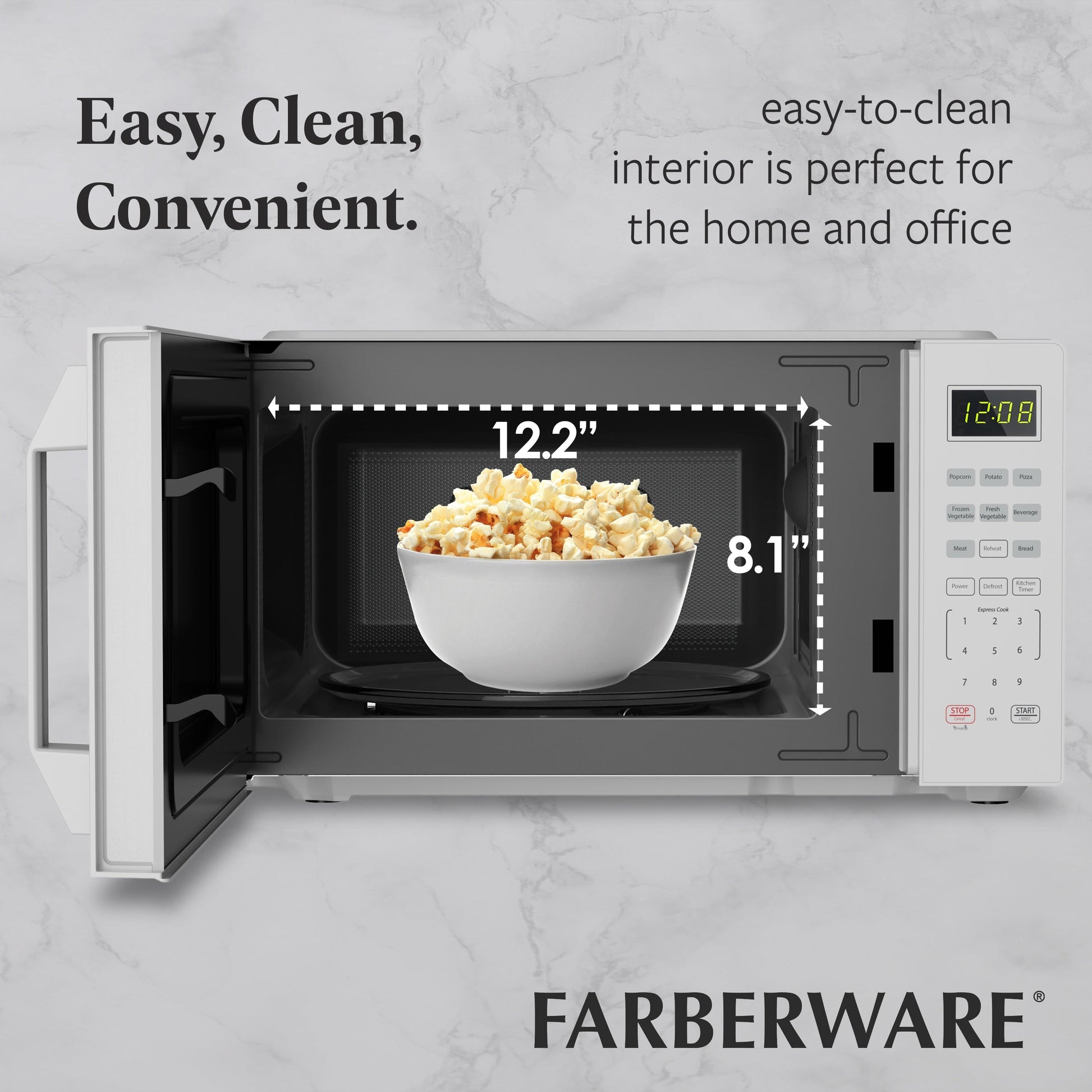 The Farberware Countertop Microwave Oven in sleek black combines modern aesthetics with powerful performance to meet your daily cooking needs. Featuring a 700-watt output and 0.7 cubic foot capacity, this microwave oven is perfect for small kitchens, dorm rooms, or offices. The digital control panel offers intuitive navigation through ten power levels, while the auto-cook functions provide quick options for popcorn, pizza, potatoes, and more. The 9.56-inch turntable ensures even cooking, and the child safety lock adds peace of mind. Its durable, easy-to-clean interior and energy-efficient operation make it an ideal addition to any modern kitchen.