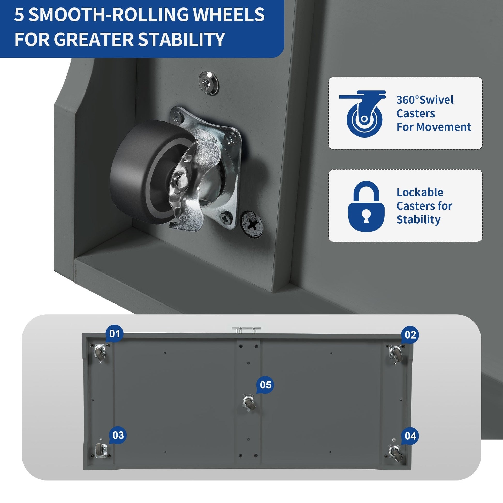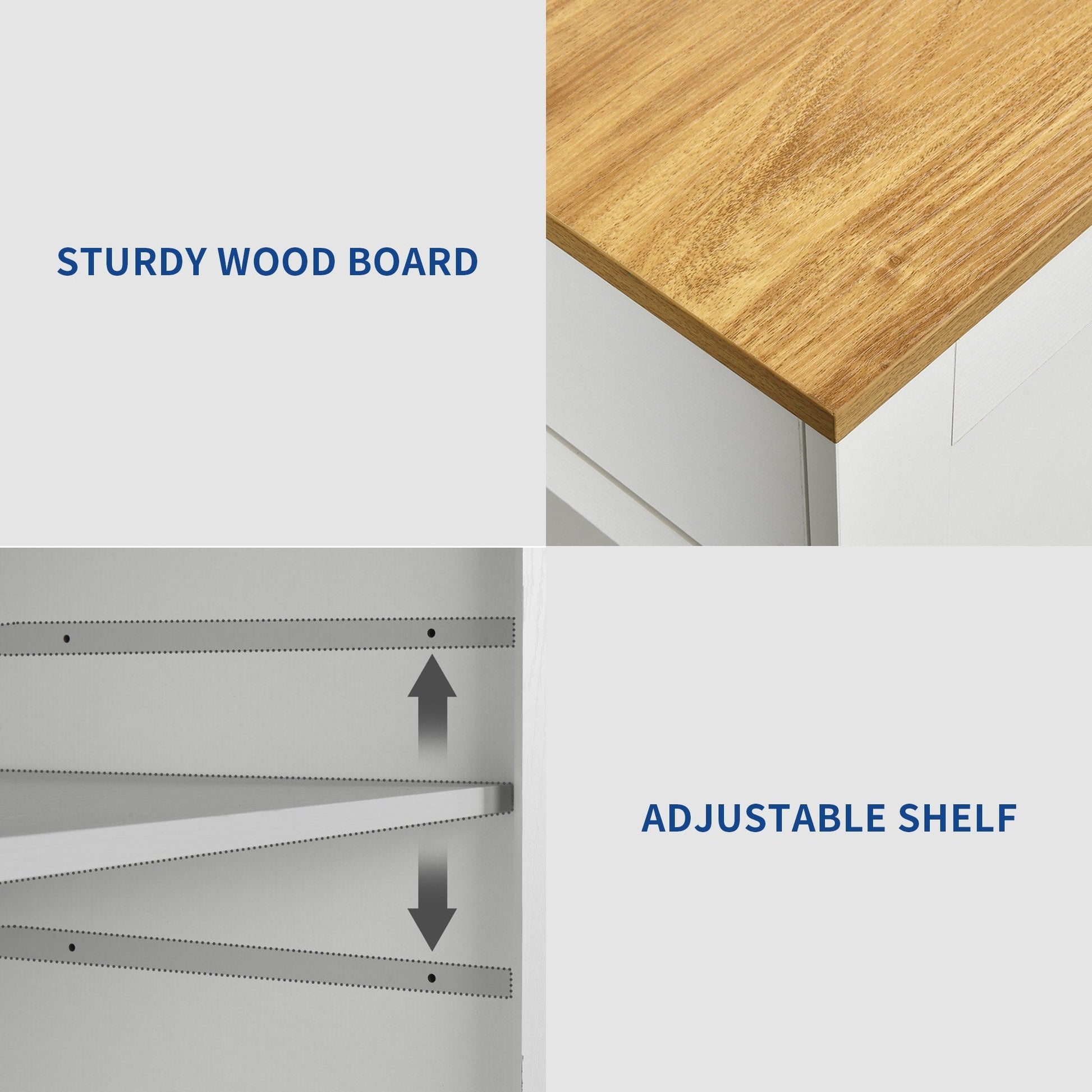 Check out our tilt-out trash can cabinet! This essential addition to your kitchen island helps keep your kitchen and dining area clean and fresh by securely storing a 10-gallon trash can (not included) to prevent odors. It provides ample storage space with 2 drawers for utensils, dinnerware, and stationery, and 3 side open shelves for spices. The adjustable shelf inside the cabinet can accommodate various kitchen items. This versatile cart comes with lockable rolling wheels for easy movement and locking for food prep or storage. Ideal for kitchens, dining rooms, and restaurants, this cabinet is made of safe CARB phase Ⅱ certified MDF boards. Assembly is simple with clear instructions.