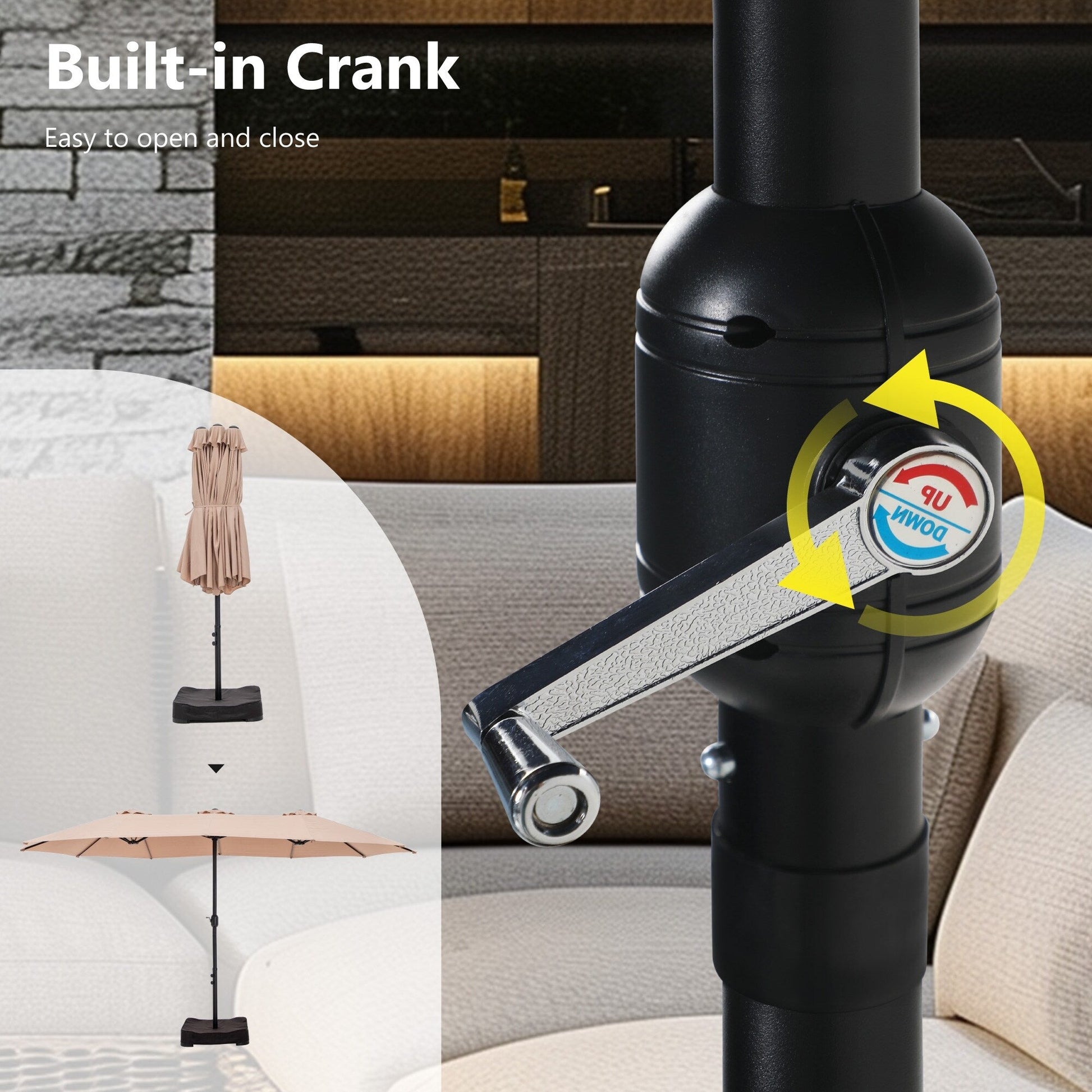 NOTE: For your safety and to avoid unnecessary damage, please keep the umbrella closed and secured when it's under strong wind or not at use.