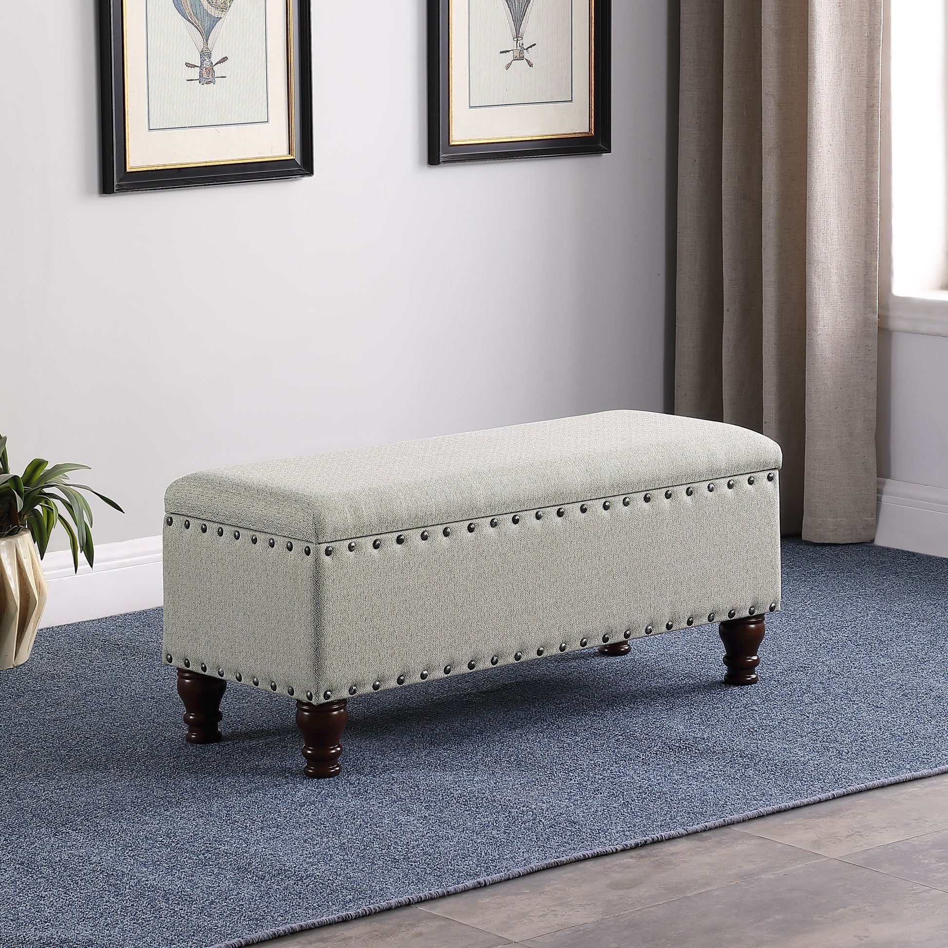 The Copper Grove Muscari Upholstered Storage Bench with Nailhead Trim is the perfect addition to your home decor. This classic, long rectangle bench features a solid textured fabric and bronze nailhead trim that exudes elegance. With wood legs in a range of rich finishes, this bench compliments many interior design styles. The multifunctional bench can provide comfortable seating, double as a coffee table, serve as a bedroom bench, or an entryway bench with ample storage. The hinged lid is reinforced for safety and reveals a deep storage capacity. Available in a range of textured solid colors, this bench is easy to assemble and maintain.