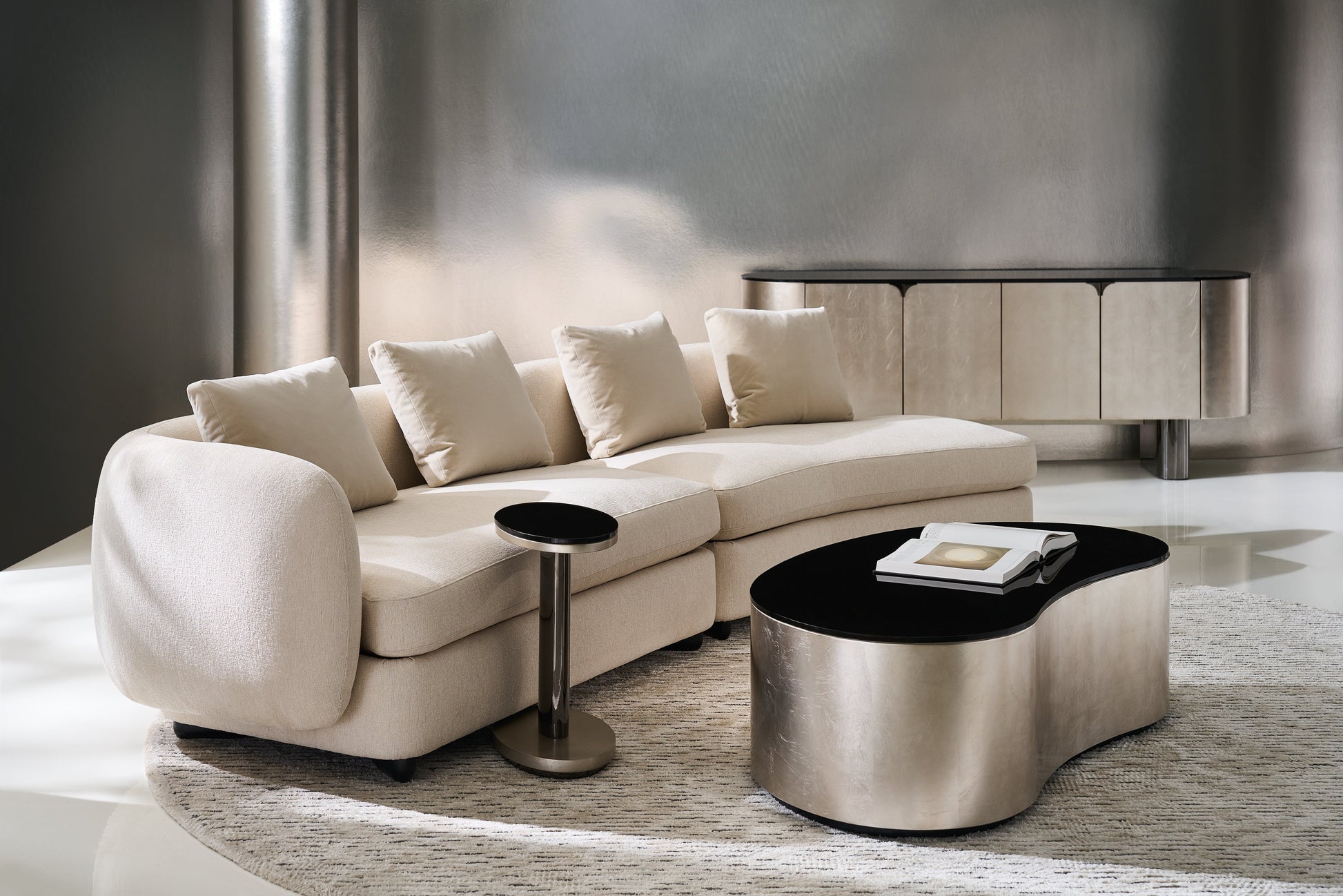 This kidney table with retro appeal softens any highly contemporary room. A wide, smooth-surfaced case shimmers in Charcoal Leaf and makes this piece stand out. Its top is Smoked Bronze glass. The plinth is Almost Black with hidden casters for easy moving of this handsome piece. This piece nestles well with the Amalie Table.