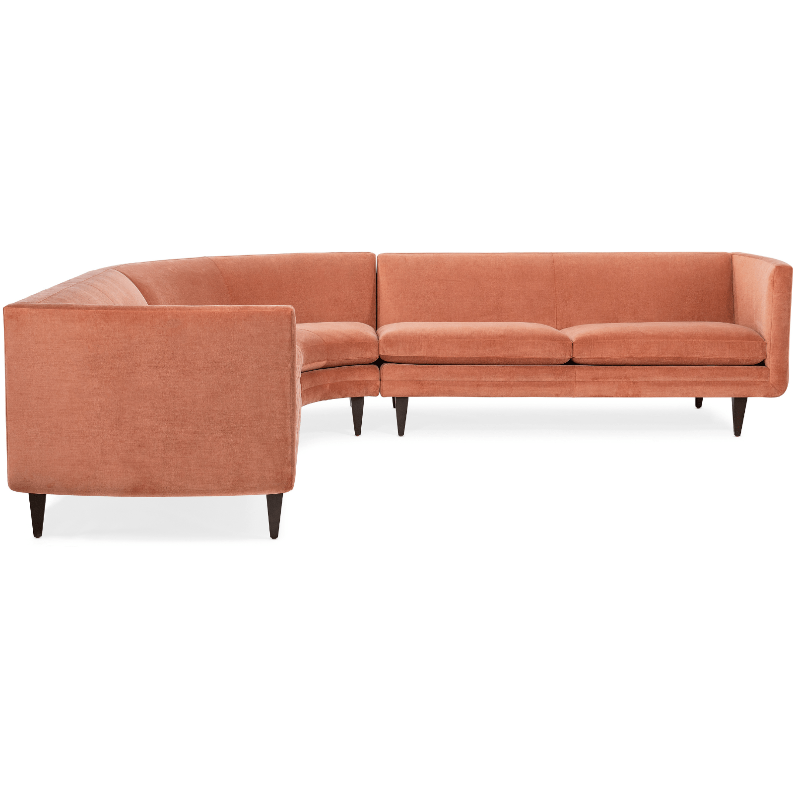 A tight seat back keeps the silhouette crisp, while the gracefully curved arms and gently tapered legs lend an elevated presence. The configuration includes a central corner wedge that anchors the design and two bench-style seats—one left-facing and one right-facing—to offer generous lounging space.
