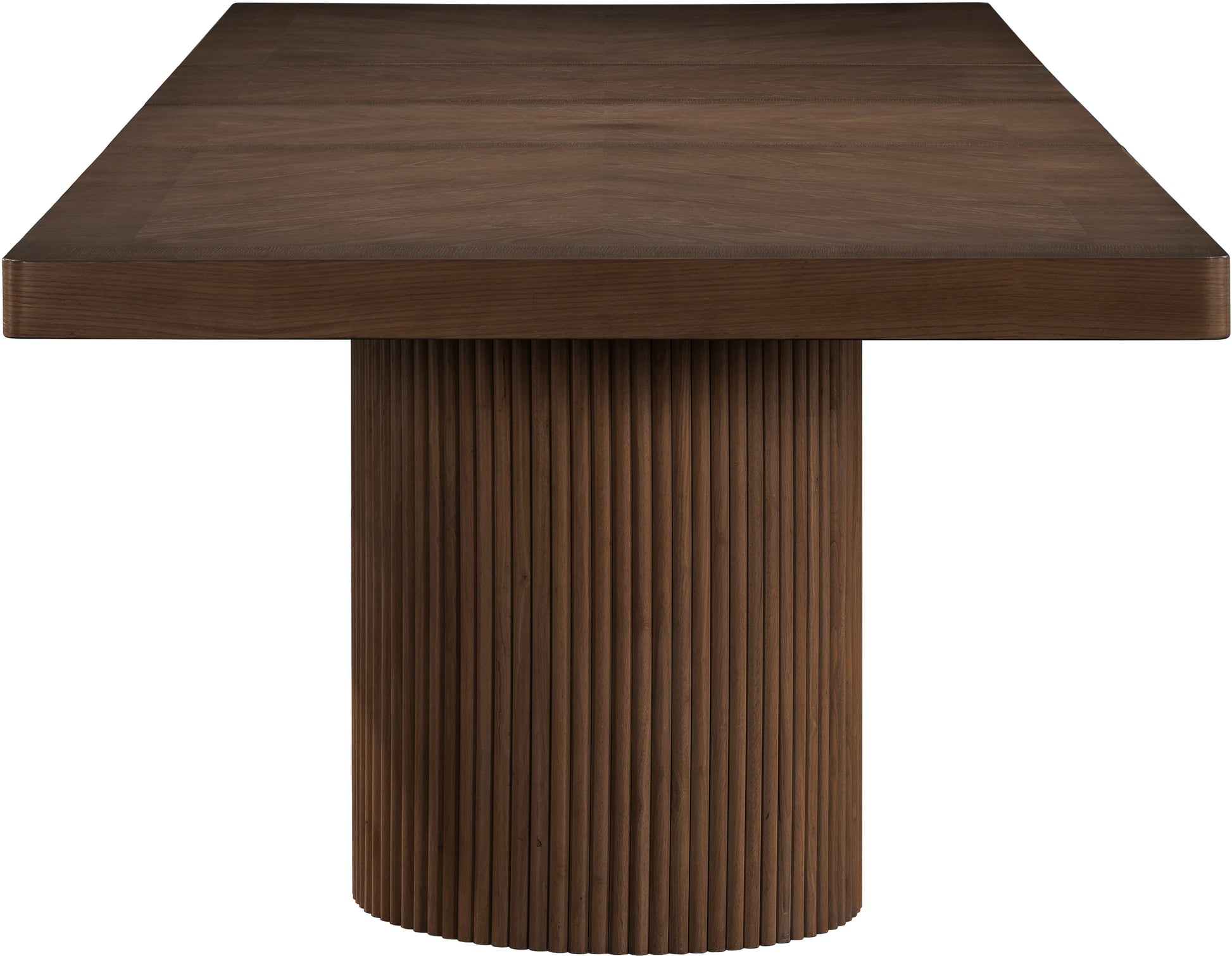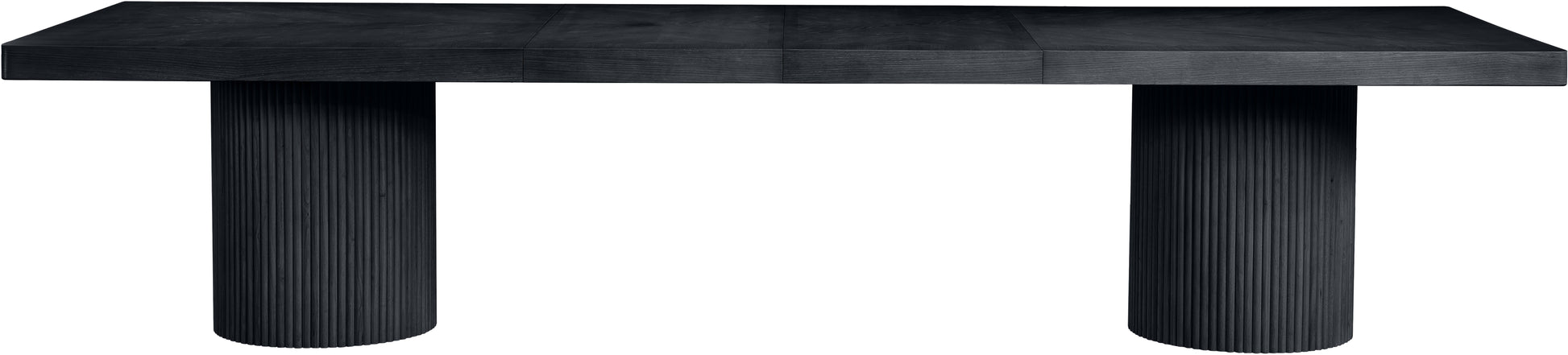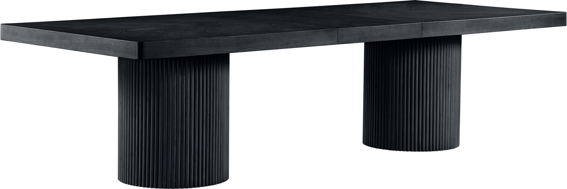 Seat guests in style when they gather around this Belinda brown oak dining table. From simple suppers with the gang to more elaborate meals with family and friends, this table is amply sized to seat them all with oodles of elbow room to spare. The rich black finish gives the table a contemporary edge while a mix of solid wood and MDF ensures lasting stability. Resting on two fluted bases, this table offers the perfect mix of simple and elegant for your modern dining room.