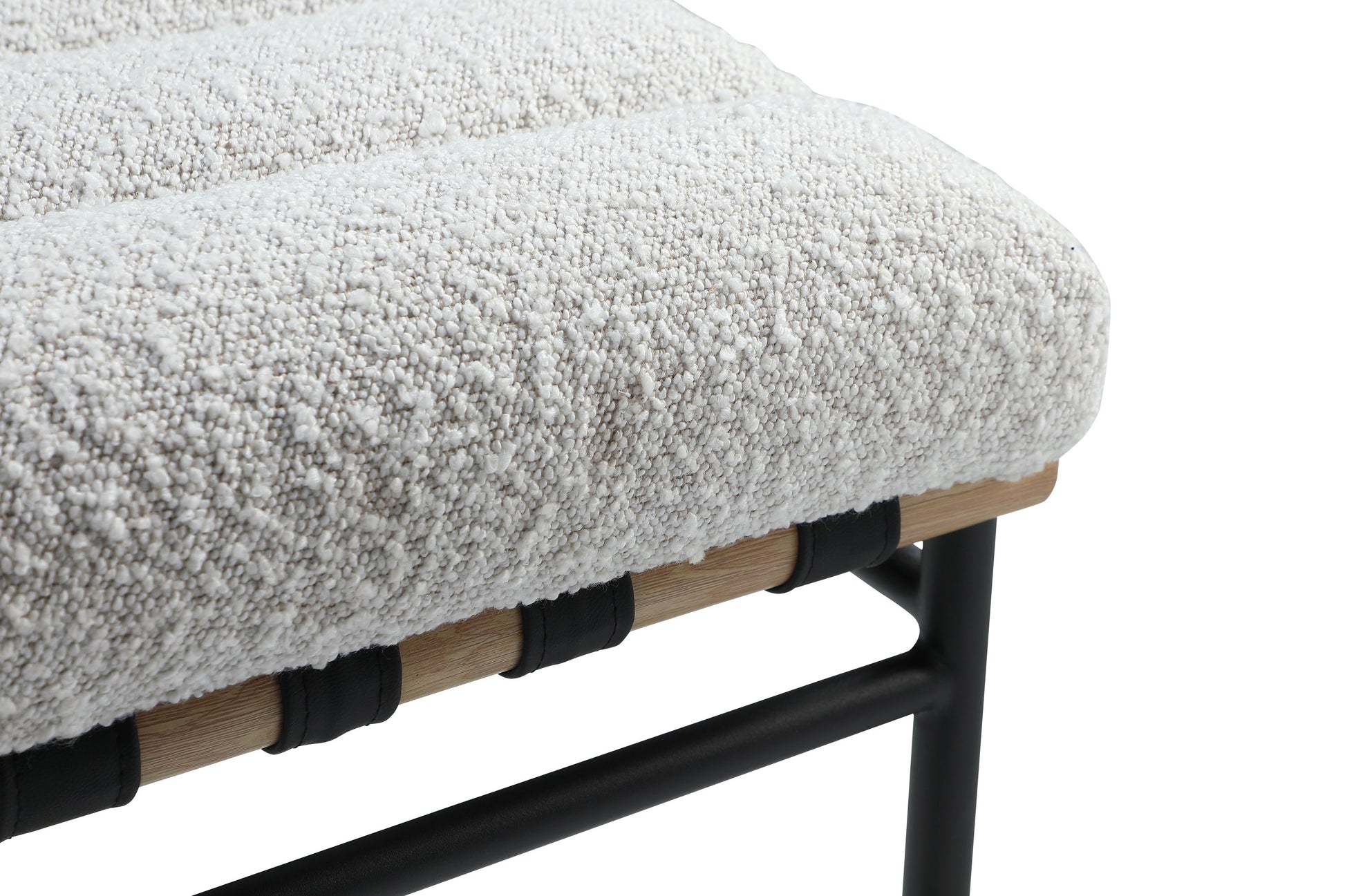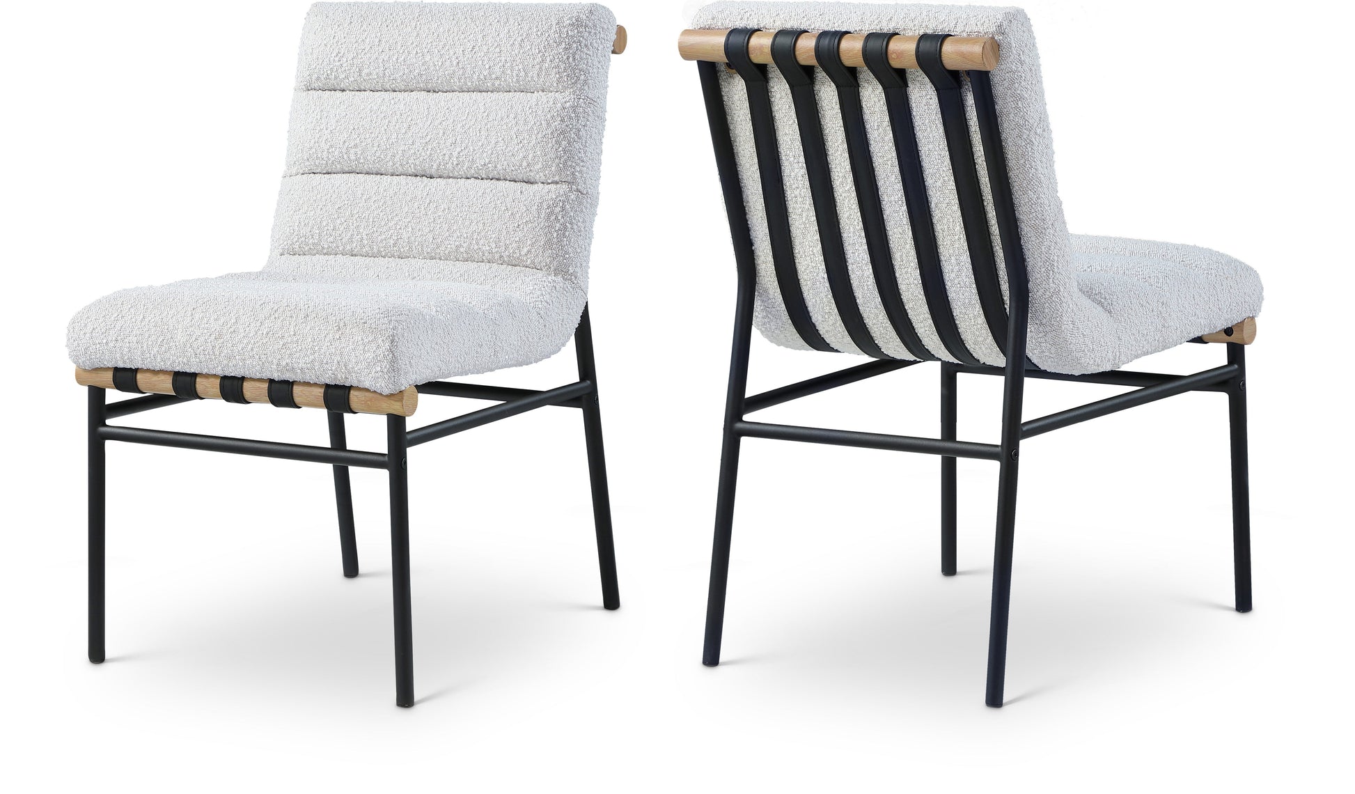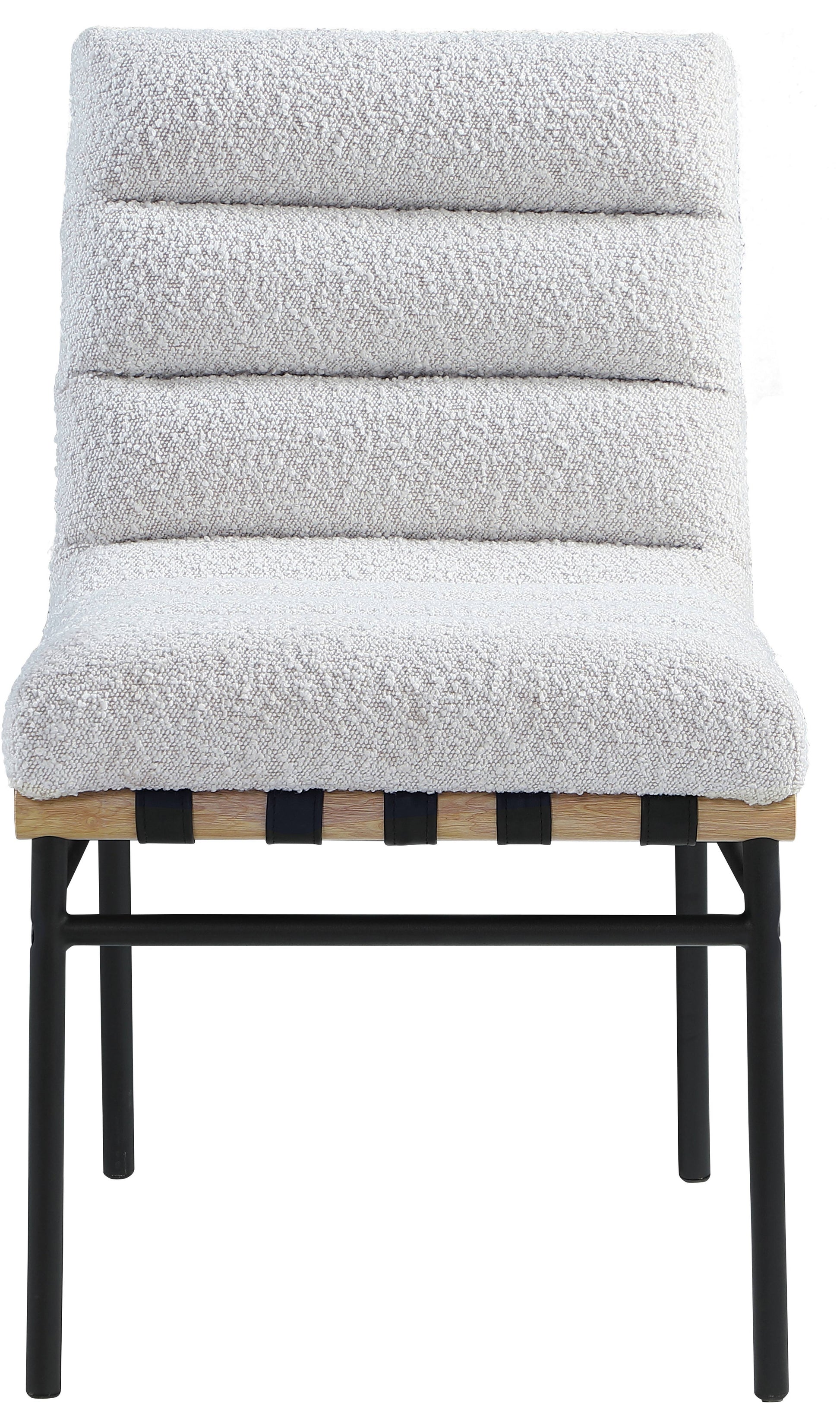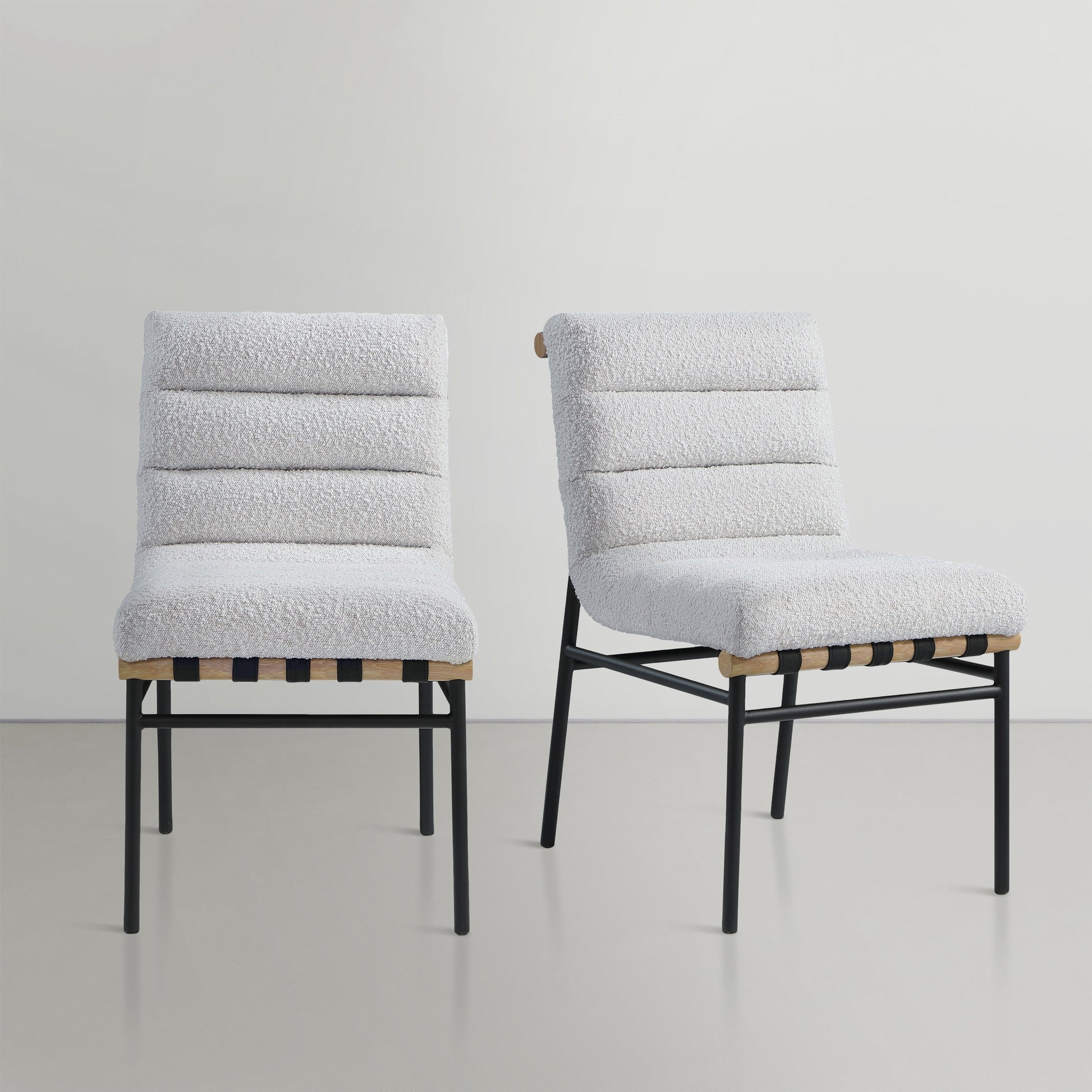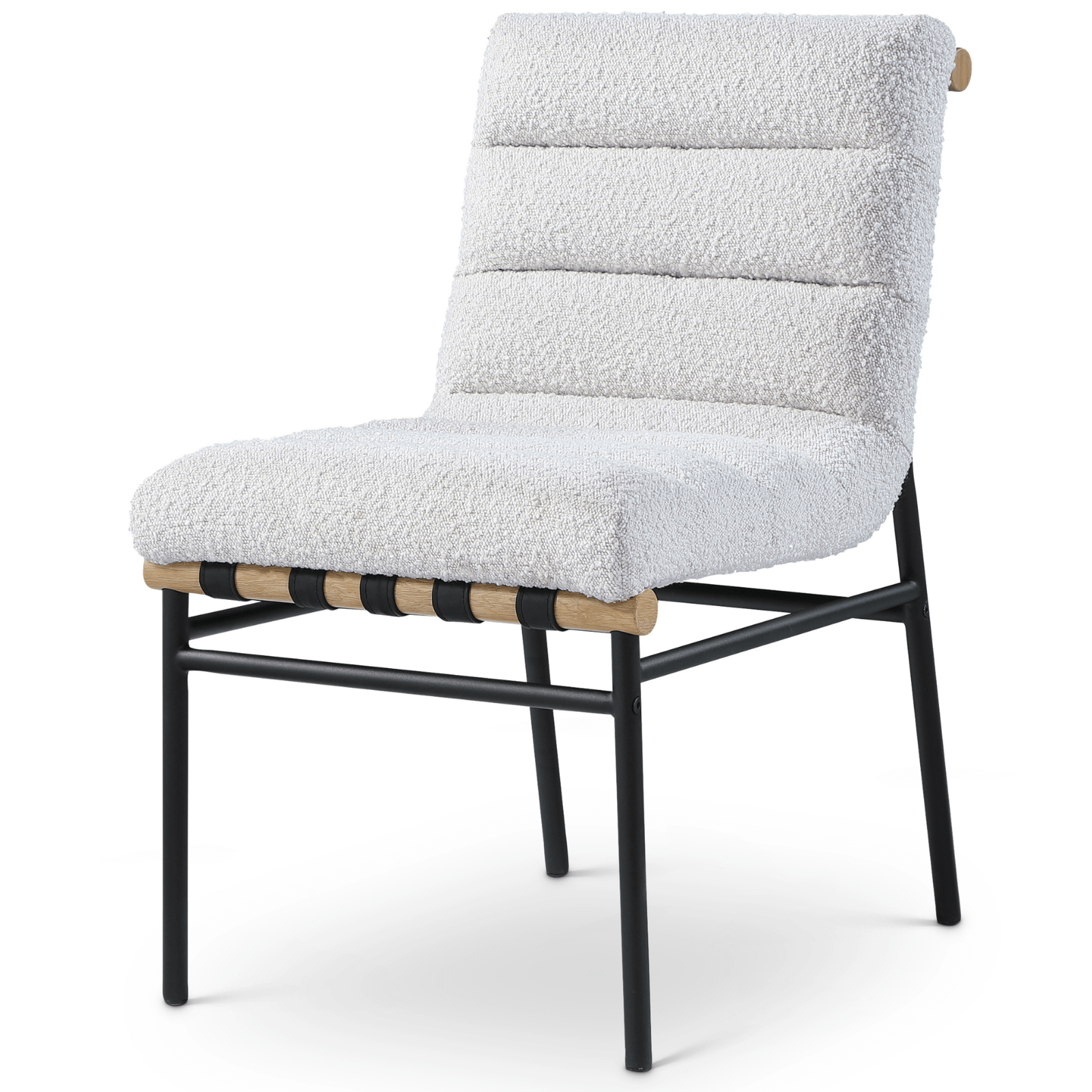 Keep guests sitting pretty for the entire meal with this Burke cream boucle fabric dining chair. This chair has rolled tufting for amazing support and durability, and features an armless design that facilitates conversation between diners. A white oak veneer metal dowel on the back of the chair and under the seat lends additional interest to this modish dining chair option.