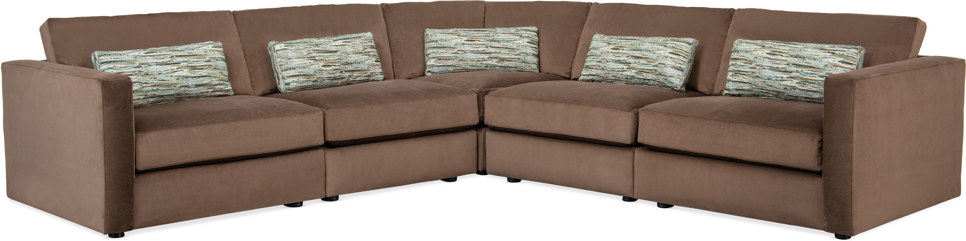 This generously sized sectional features five seat cushions and a deep corner wedge, creating ample space for lounging or entertaining. The track arms and low-profile feet enhance its modern silhouette, while the included five rectangular accent pillows in a serene blend of aqua, beige, and brown tones bring a touch of visual texture and contrast.