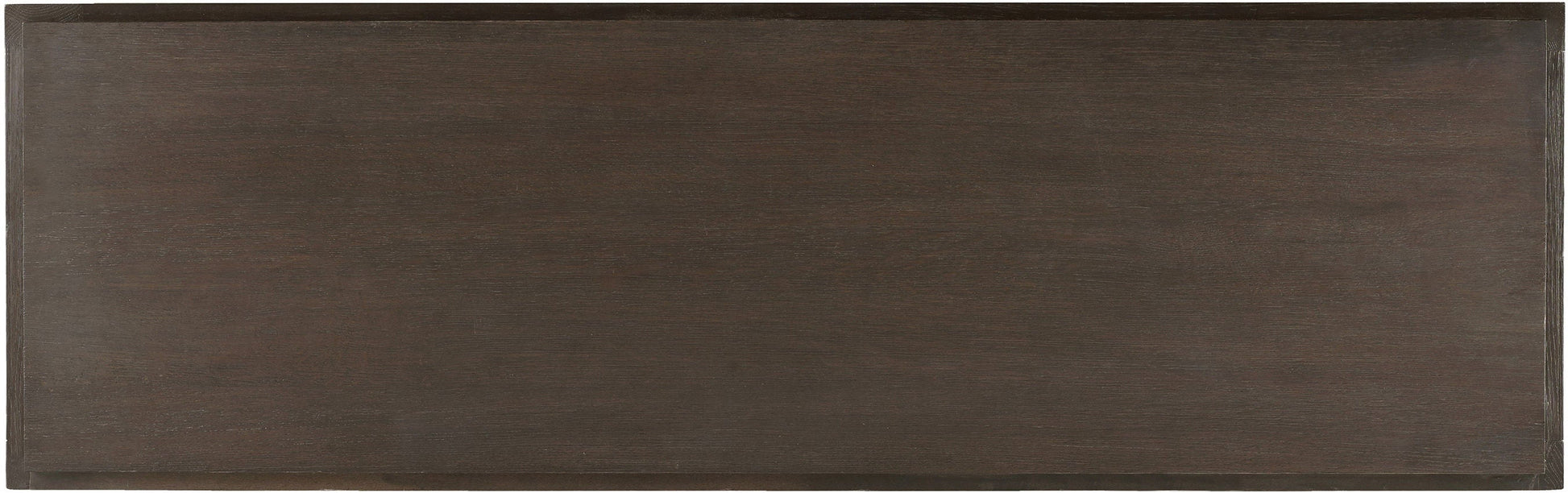 - Finish: The finish is a deep, brown called Midnight. Hardware is a brushed brass pull. Distressing includes wire brushing.