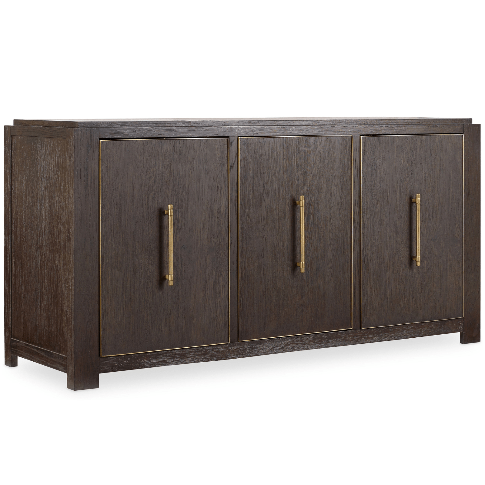 Inspired by timeless simple shapes with a chic mixture of tactile materials, the Curata Buffet Credenza is crafted of White Oak Veneers with an earthy Midnight finish accented by vertical brushed brass pulls on each of the 3 doors. There are two adjustable shelves behind each door for roomy storage. Create a curated chic modern look with an eclectic mix of sophisticated materials and finishes in the Curata Collection. Curata, meaning 'curated' in Italian, mixes materials like black nickel, stainless brushed brass and marble with three distinct rustic modern finishes for a simple, yet urbane design. Inspired by timeless shapes and chic materials, Curata exudes a 'less is more' feel by spotlighting the design of each piece and giving precise attention to detail.