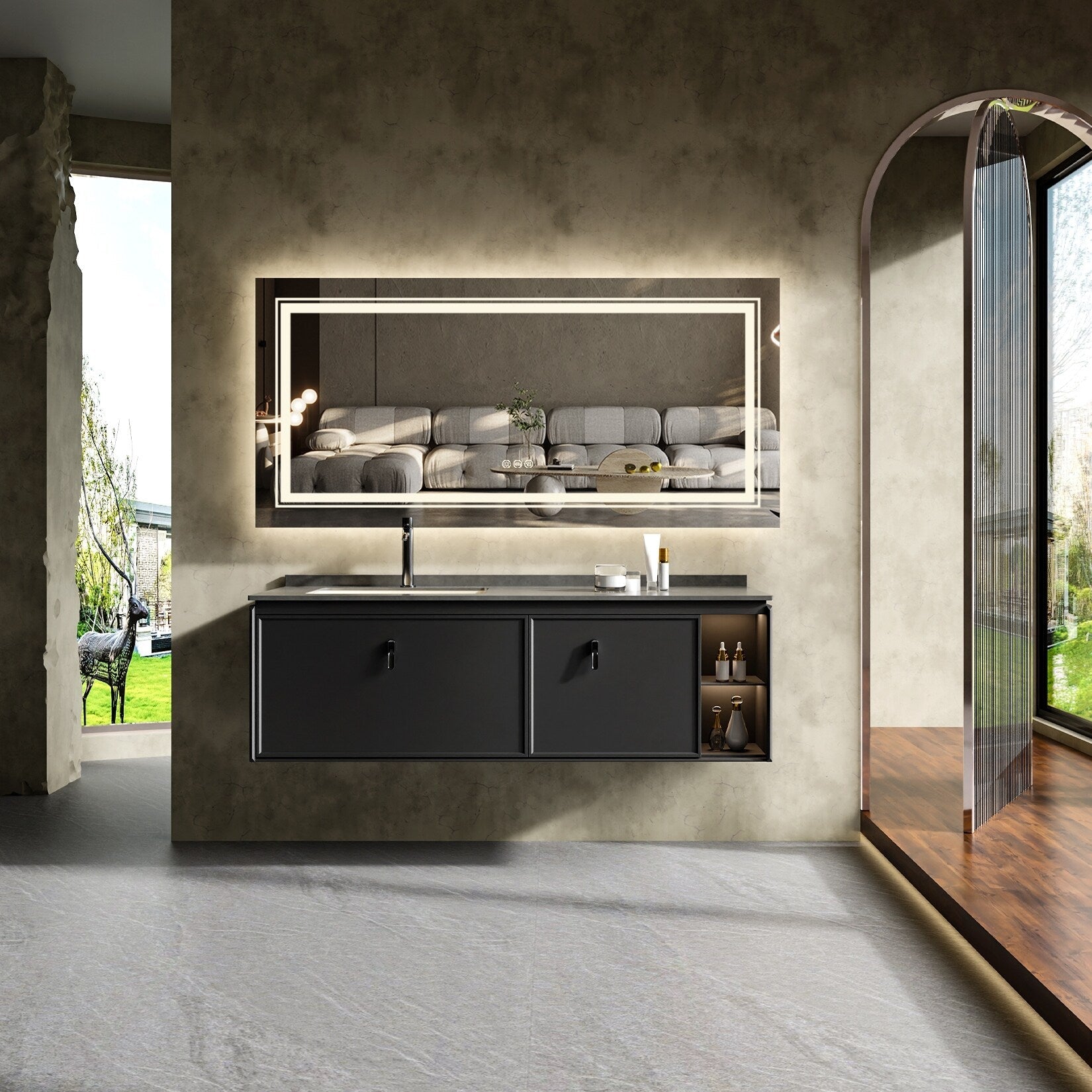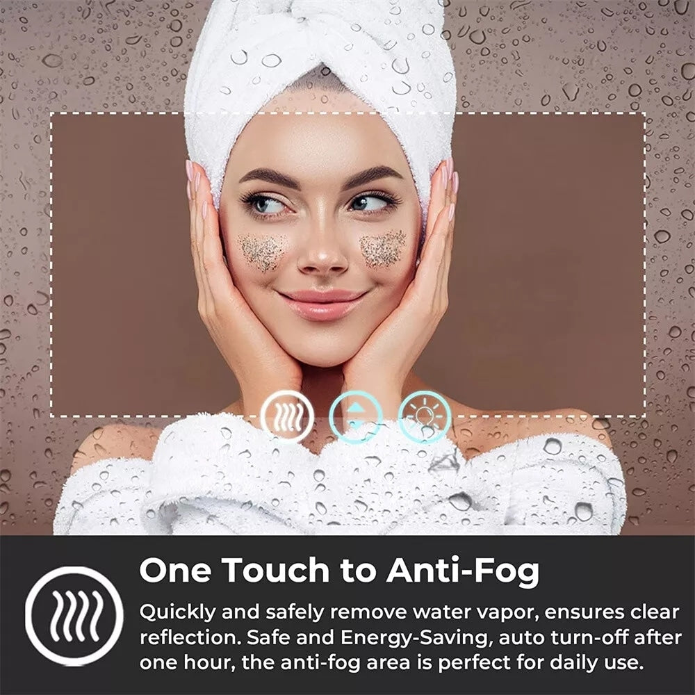 Upgrade your bathroom with our Extra Large LED Lighted Bathroom Mirror Wall Anti-Fog Vanity 3 Colors! Enjoy the perfect reflection for your daily routine with high-lumen and accurate 90+ CRI lighting. Say goodbye to constantly treating your mirror with fog-free spray, as this mirror features a built-in anti-fogging function. Choose between 3 light temperatures and dim the lights with the touch sensor, perfect for daily makeup. This mirror is made with environmentally friendly materials and has a long LED lifetime of over 50,000 hours. Hang it both horizontally or vertically for a modern and minimalist look. Comes with a 3-year warranty and factory replacement parts.