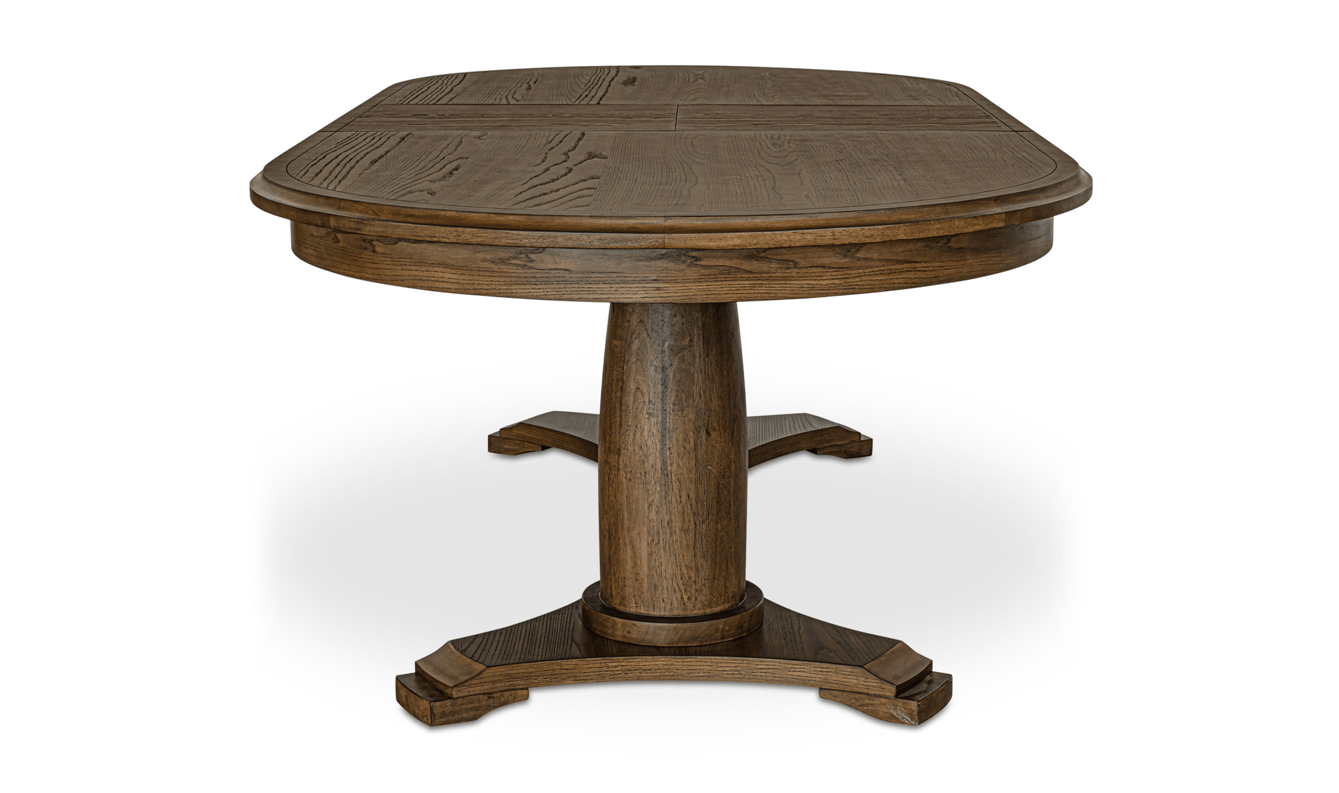 The Jamie extension dining table revamps the traditional silhouette, presenting a thick tabletop elegantly perched on sturdy, traditional-profile double pedestal bases. The table features a seamless, self-storage butterfly extension mechanism, allowing for effortless adaptation to welcome additional guests, and its rich, vintage brown finish ensures it harmonizes effortlessly with any interior style.