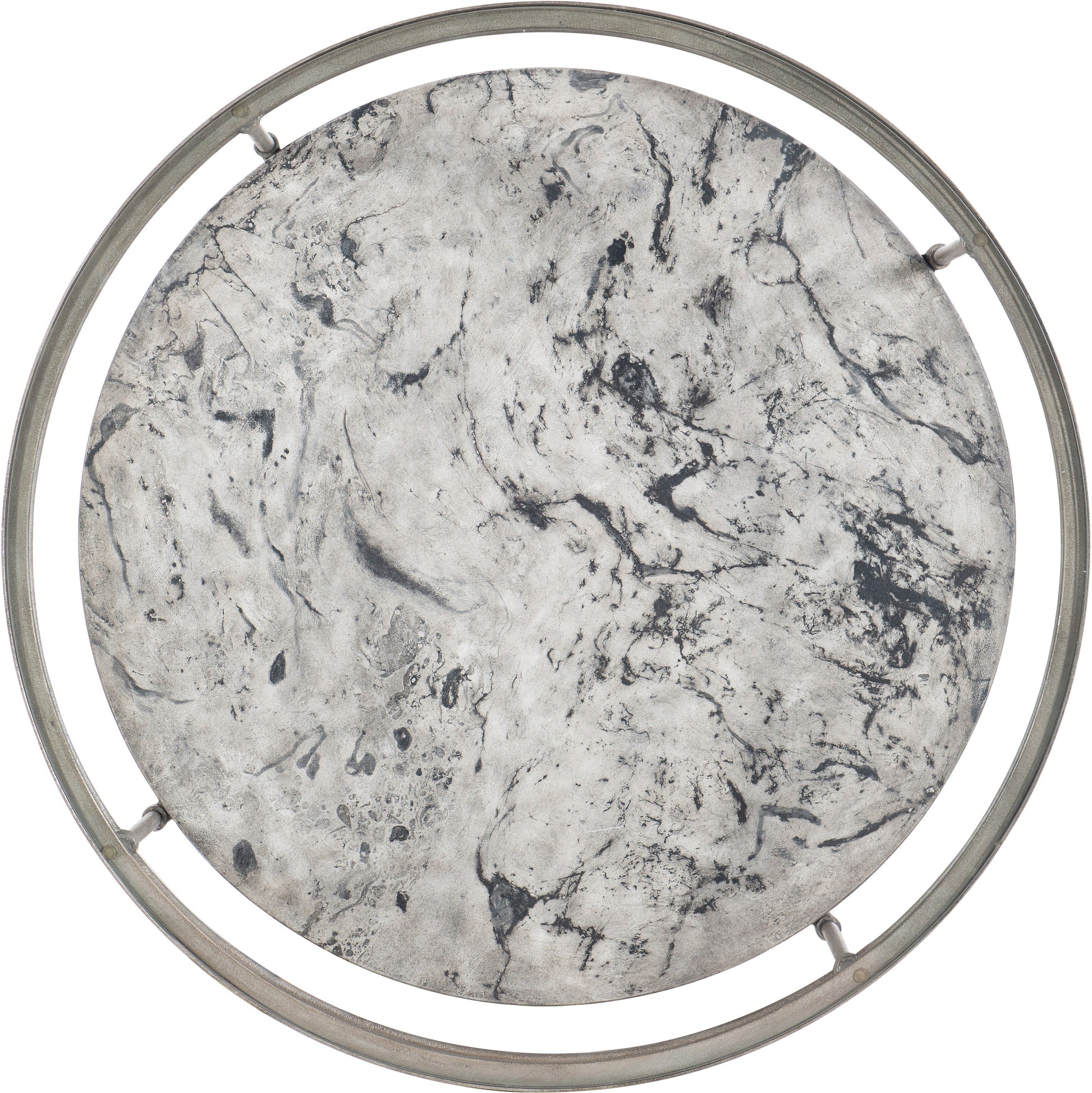 Beautifully scaled and intricately designed, this stunning round cocktail table pairs a champagne-colored metal frame with a glass top and concrete bottom with a soft gray and black pattern. Give your home a shot of style with our living room furniture. Make this room the perfect spot for conversation, entertaining or just relaxing.