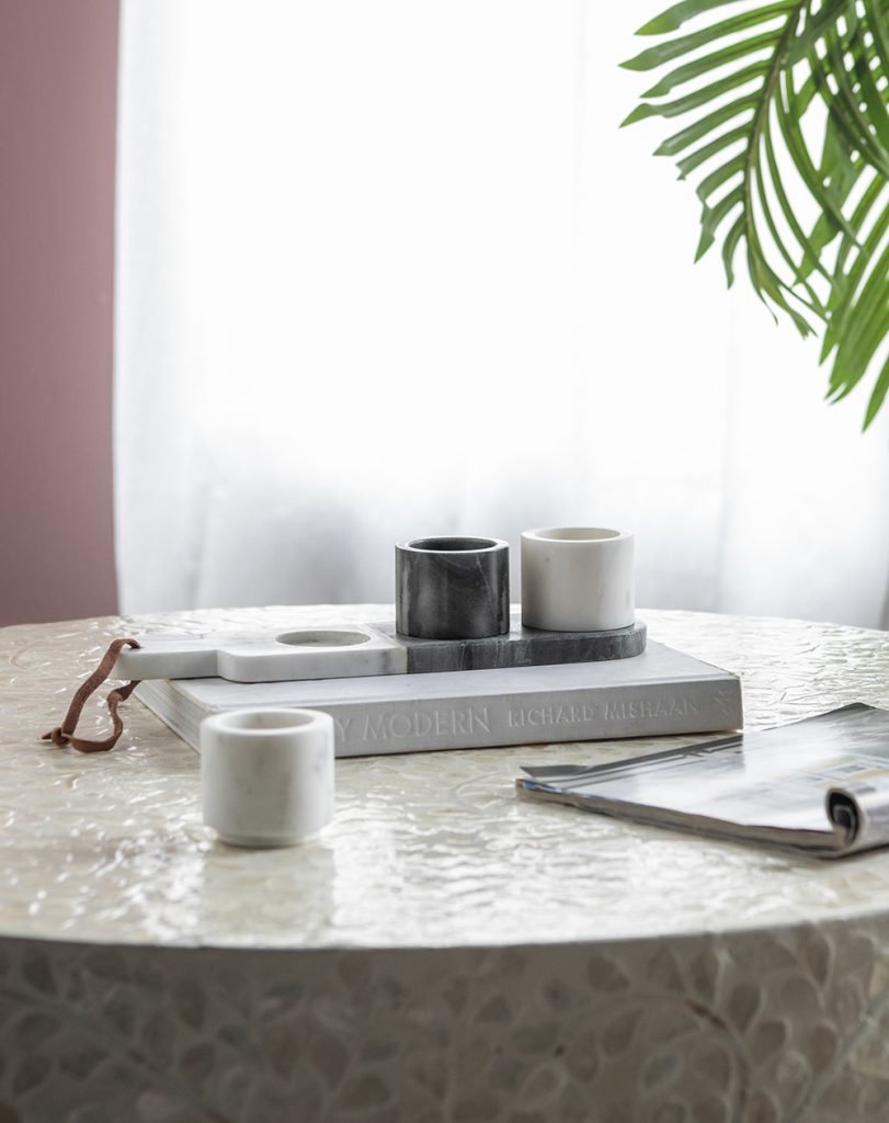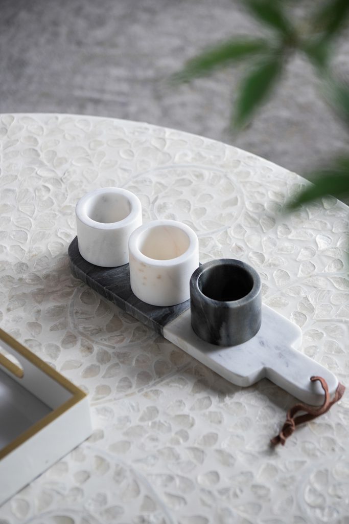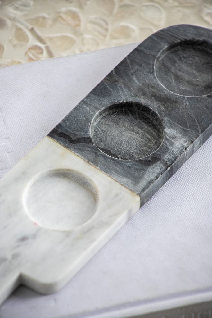 A tasting board never looked as good as the Jayce condiment cups and tray. This set of four features three marble cups and marble tray to present them on.