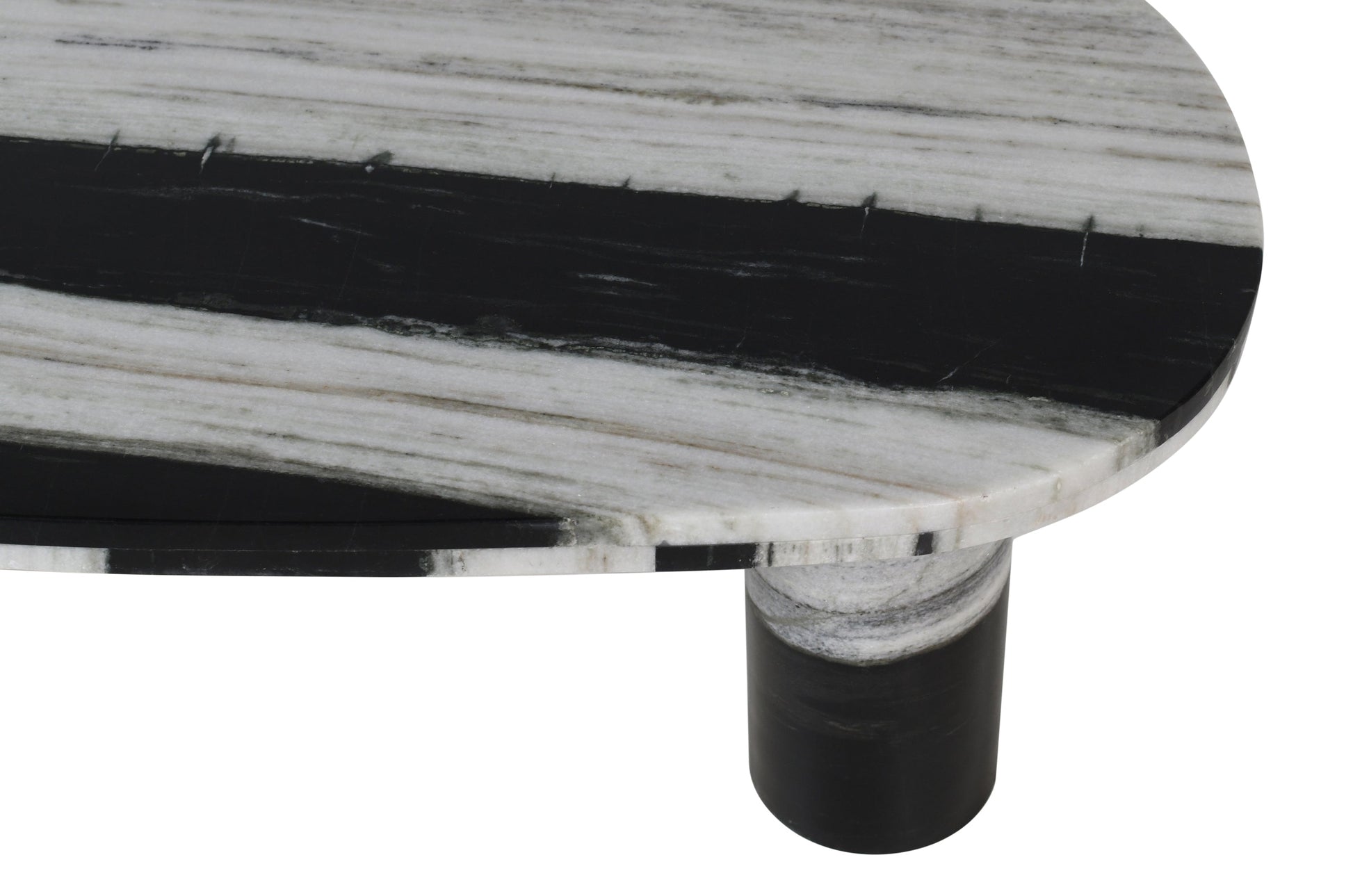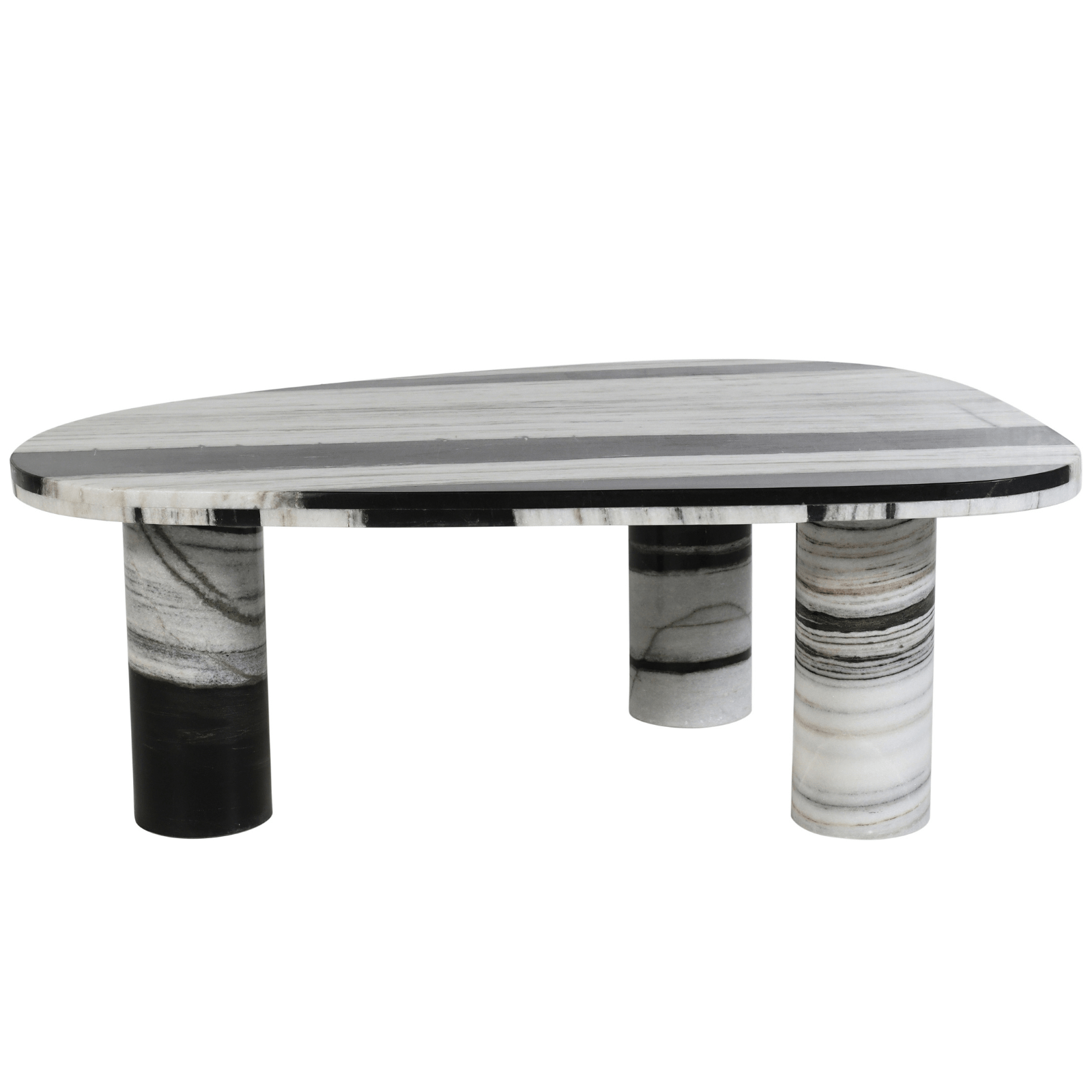 Make a bold monochromatic statement with the Panda Marble Coffee Table—where sculptural form meets the striking beauty of nature. Handcrafted from genuine panda marble, this piece is distinguished by its vivid bands of deep black and soft white, evoking the graphic contrast of ink on parchment. The asymmetrical tabletop shape adds a modern sculptural edge, while three cylindrical legs echo the organic rhythm of the stone’s natural striations. Every angle showcases the marble’s wild elegance—from wisps of grey to bold black streaks—making each table a functional piece of art. A perfect match for contemporary, eclectic, or gallery-inspired interiors.