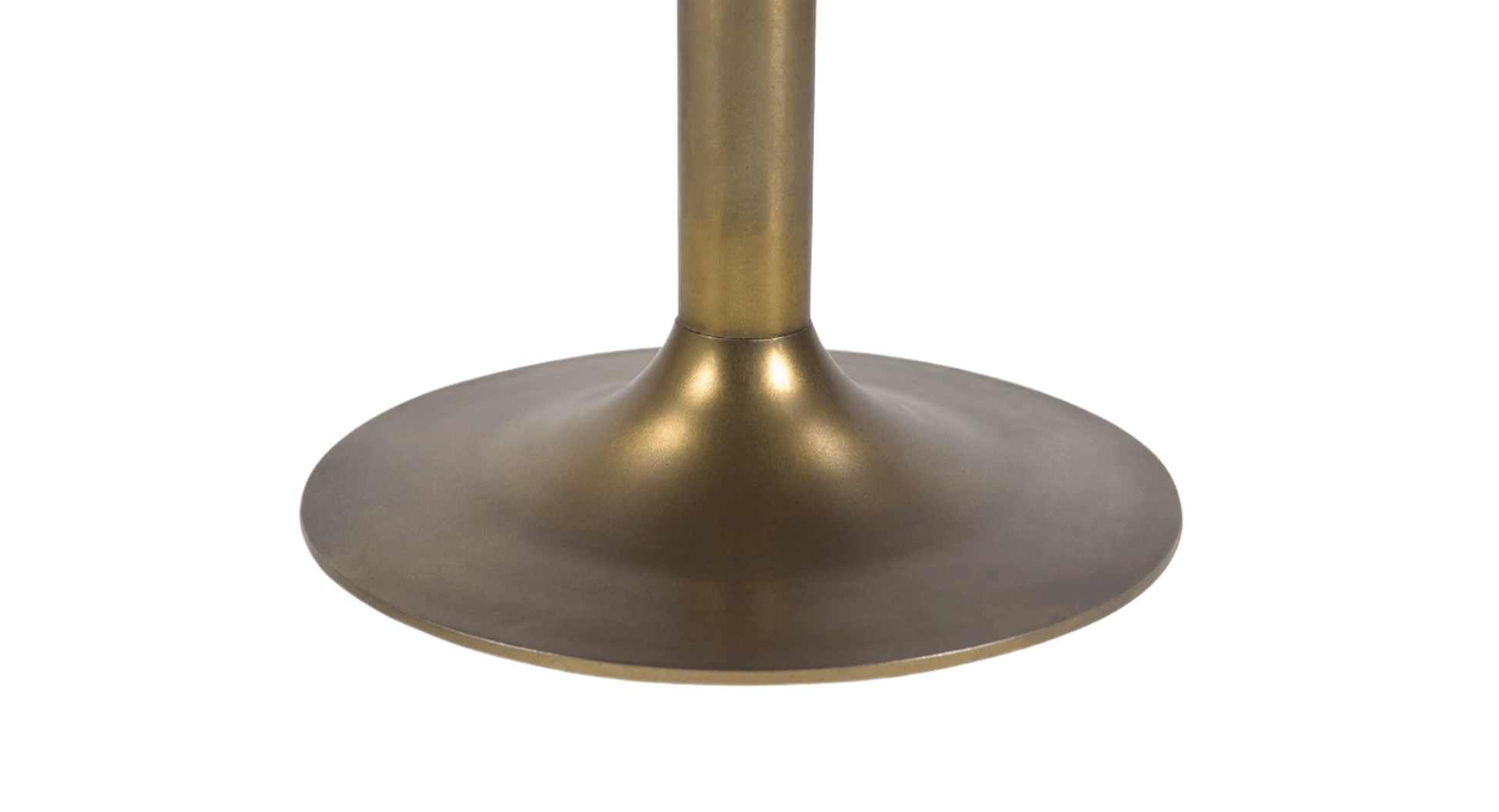 - Antiqued-Brass Pedestal Base: The sleek iron pedestal is finished in a warm antiqued brass, offering a refined vintage touch that contrasts beautifully with the organic wood top.