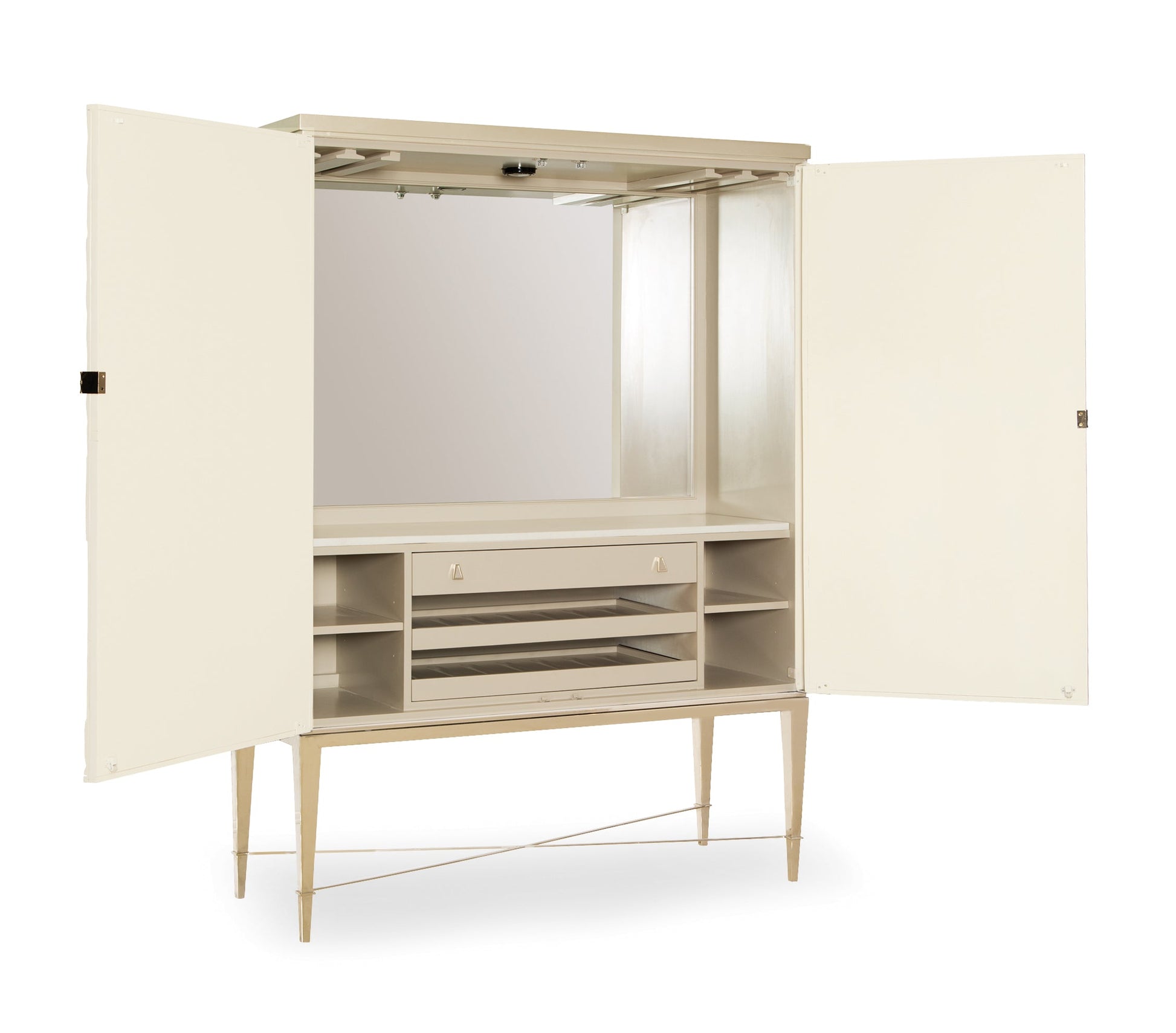 An artistic take on the classic palm tree, Palms Up! provides a stunning focal point for your living or dining room. However, beauty is not just skin deep. Behind the hand-carved doors reside the quintessential bar for entertaining. A white marble work surface sits atop a deep drawer for storing drink making essentials and two open shelves that will cradle your favorite wines. The interior is finished in a Soft Taupe and features a mirrored back with hanging wine glass holder. This closed storage piece truly sets the bar high.