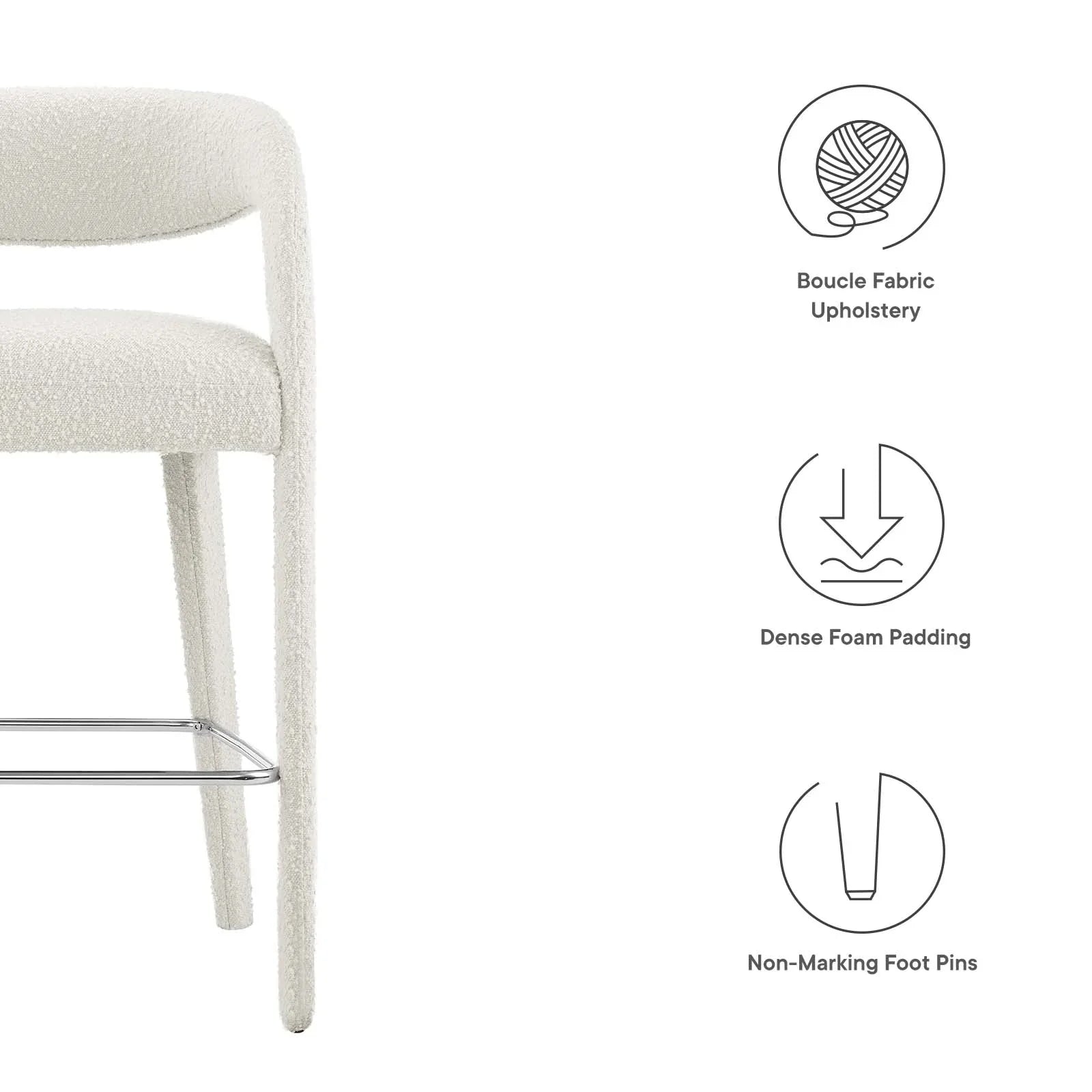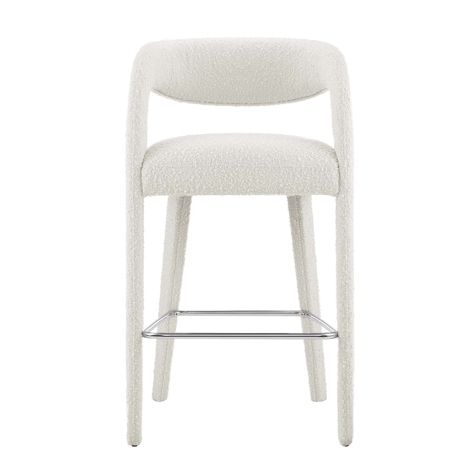 Experience the perfect blend of modern sophistication and luxurious comfort with the Pinnacle Boucle Fabric Upholstered Bar Stool Set of Two. The distinct silhouette showcases a curved backrest and an open design that effortlessly enhances your dining space or kitchen area with luxe style. This bar-height stool set indulges your senses with its dense foam padding, upholstered in a tactile, nubby textured boucle fabric. Non-marking plastic foot pins ensure your flooring remains free from scuffs and scratches. With minimal assembly needed, this bar stool set not only offers a stylish statement but also a hassle-free setup. Weight Capacity: 330 lbs.