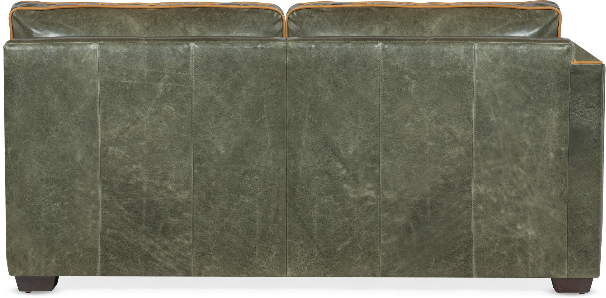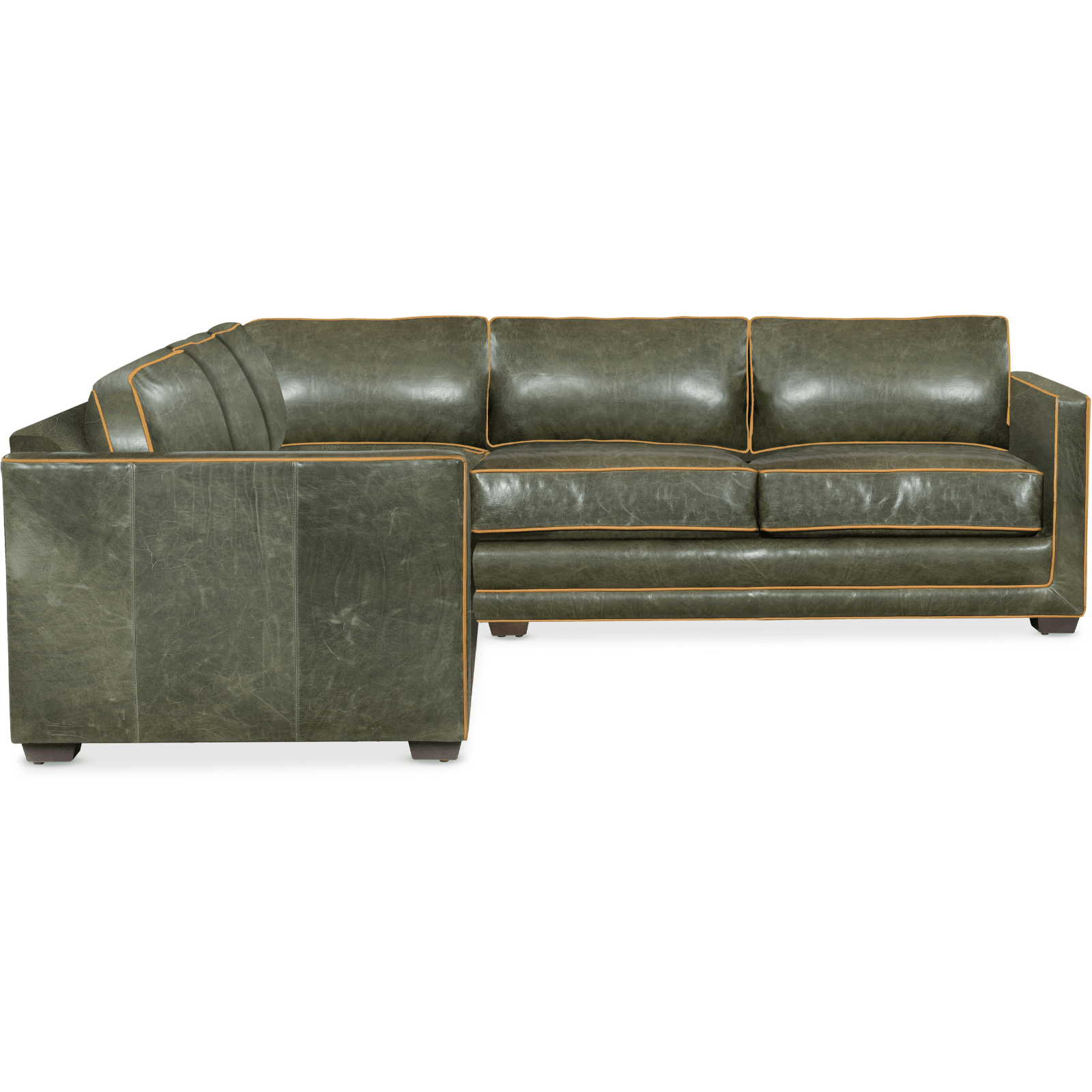 Sculptural lines meet refined craftsmanship in the Raine Sectional, an elevated statement piece for modern living. Wrapped in rich top grain aniline leather in Marcel Moss Green, the Raine exudes depth and texture with a softly distressed finish that ages beautifully over time. A bold contrast is achieved through the Mali Yellow welt trim, adding a tailored edge that outlines the silhouette with striking precision.