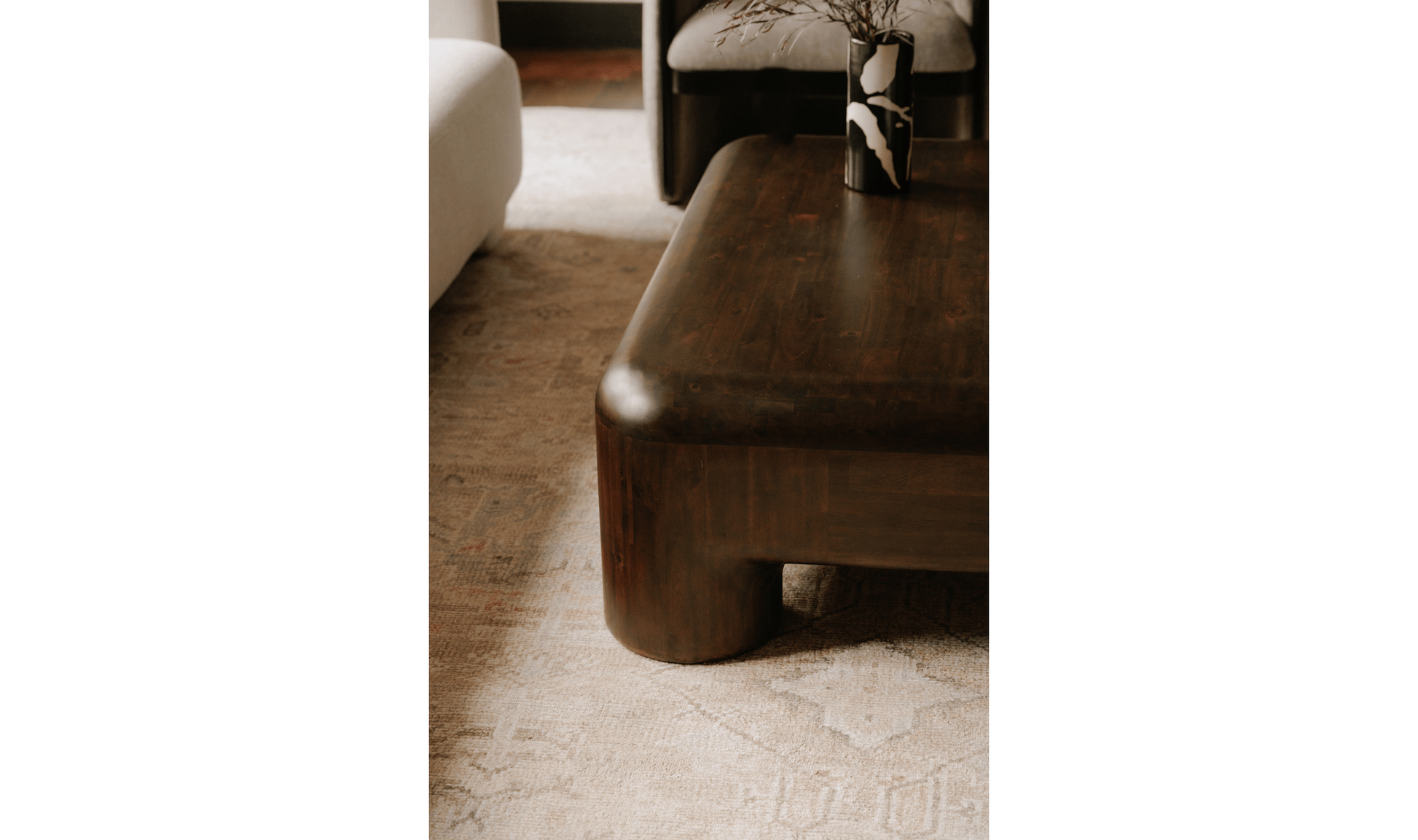 A sculptural presence with a playful yet refined spirit, the Rowan Coffee Table makes a statement in any living space. Its design is defined by bold, rounded edges and stout, pillar-like legs—forms that evoke the carefree creativity of childhood building blocks while exuding an air of timeless sophistication. The substantial silhouette anchors the room, balancing both whimsy and elegance in a way that feels inviting yet elevated.