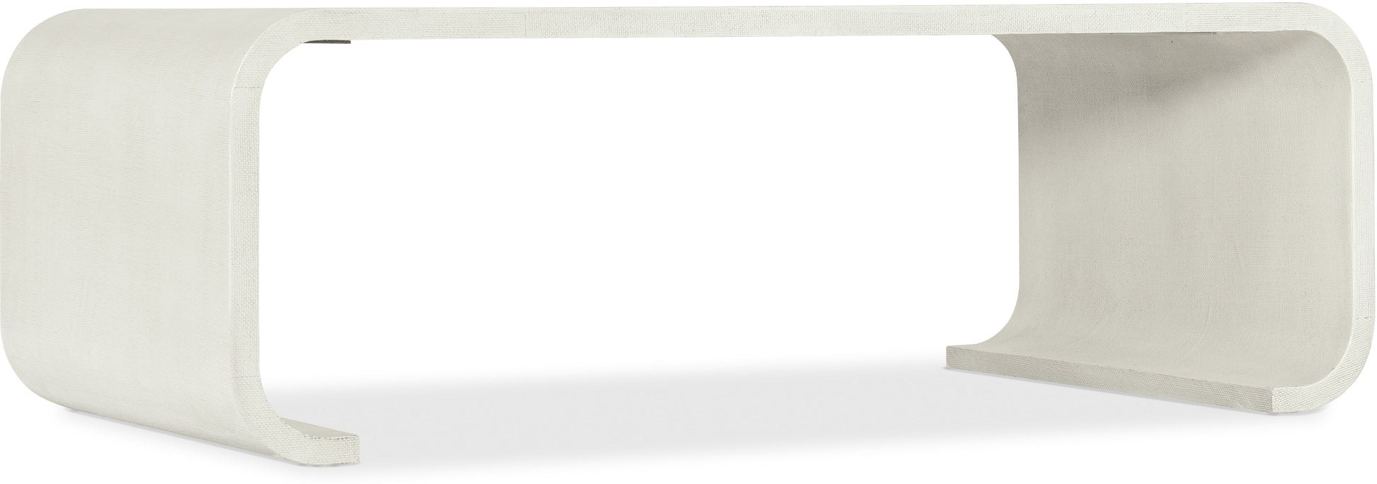 Soft, modern and organic, the Kai Cocktail Table in a rounded rectangle shape is crafted of Wood and Raffia in the soothing Sand Dollar finish, a white lacquered grasscloth to create a spa-like ambience. Designed to create a comfortable and inviting retreat within the home, the Serenity collection is defined by its casual finishes and variety of organic textures and materials that combine to deliver a relaxed aesthetic. Inspired by casual, waterfront living, the collection was designed to bring the relaxed aura of the outside in -- no matter where the consumer lives. White oak veneer delivers two key finishes – a whitewashed look and a weathered gray – and is accented with shades of soft coastal blue, sand blasted pine and soft white bronze metal details. Organic materials including abaca rope, natural stone, painted grass cloth, louvered details, and faux coral motifs add to its casual style. The collection’s silhouettes were designed to reflect three distinct personalities – a traditional nature with serpentine shaped case pieces and a softer aesthetic, a modern persona with linear shapes and coral accents, as well as a more casual contemporary character with soft-edged case pieces and organic surfaces.