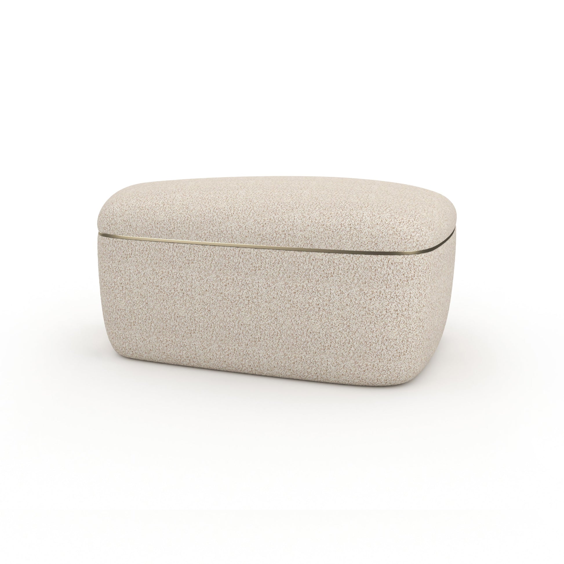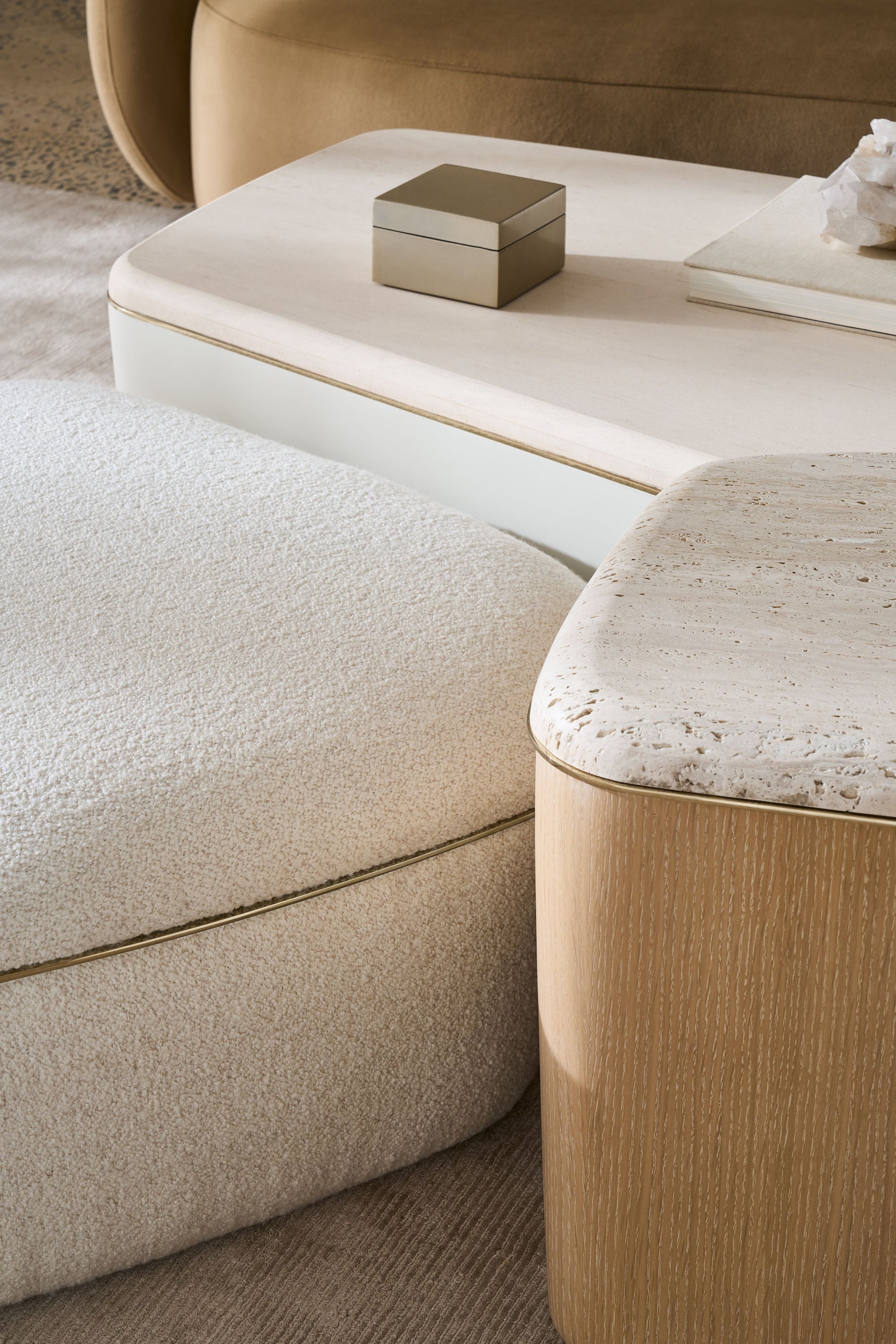 Shaped like pebbles in the dessert, the five-sided Small Serir Cocktail Table has an irregular shape with rounded sides and no sides measuring the same width or length. The top and sides are upholstered in textured Ivory Mélange Performance Bouclé. The top is surrounded by a thin banded trim of Whisper of Gold metal.