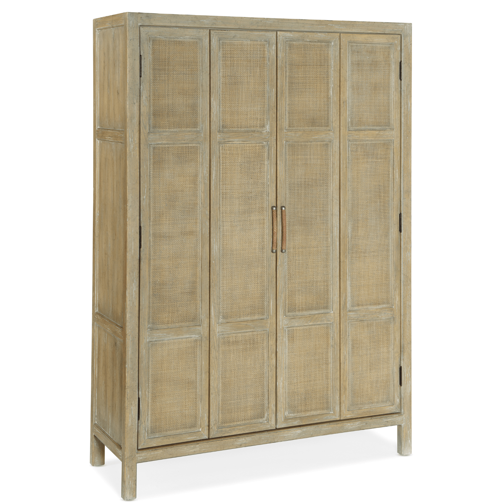 Escape the stress and extend hospitality to others with the resort-inspired Surfrider Bar Cabinet, featuring two bi-fold rattan doors, four drawers with self-closing drawer guides, two pull-out work surfaces, four pull-out wine shelves and eight stemware racks. Crafted of Pecan Veneers, Rattan and glass, the bar cabinet is finished in features the light natural Driftwood finish with distressing including sandblasting and bleaching. Lights are activated by a three-intensity touch switch. Melding the salty, yet cozy oasis of the California coastline with a modern surf culture, Surfrider is defined by the use of natural materials including rattan, jute rope, stone, gypsum, bamboo and driftwood motifs. Designed to create relaxing spaces to escape from the pressures of modern life, it is featured in a light, natural Driftwood finish. Luxurious materials, shapes and textures combine to create a relaxed, yet sophisticated style that epitomize the lifestyle of a casual, beach-town community.