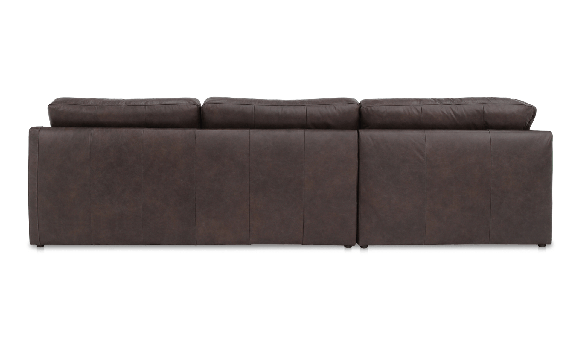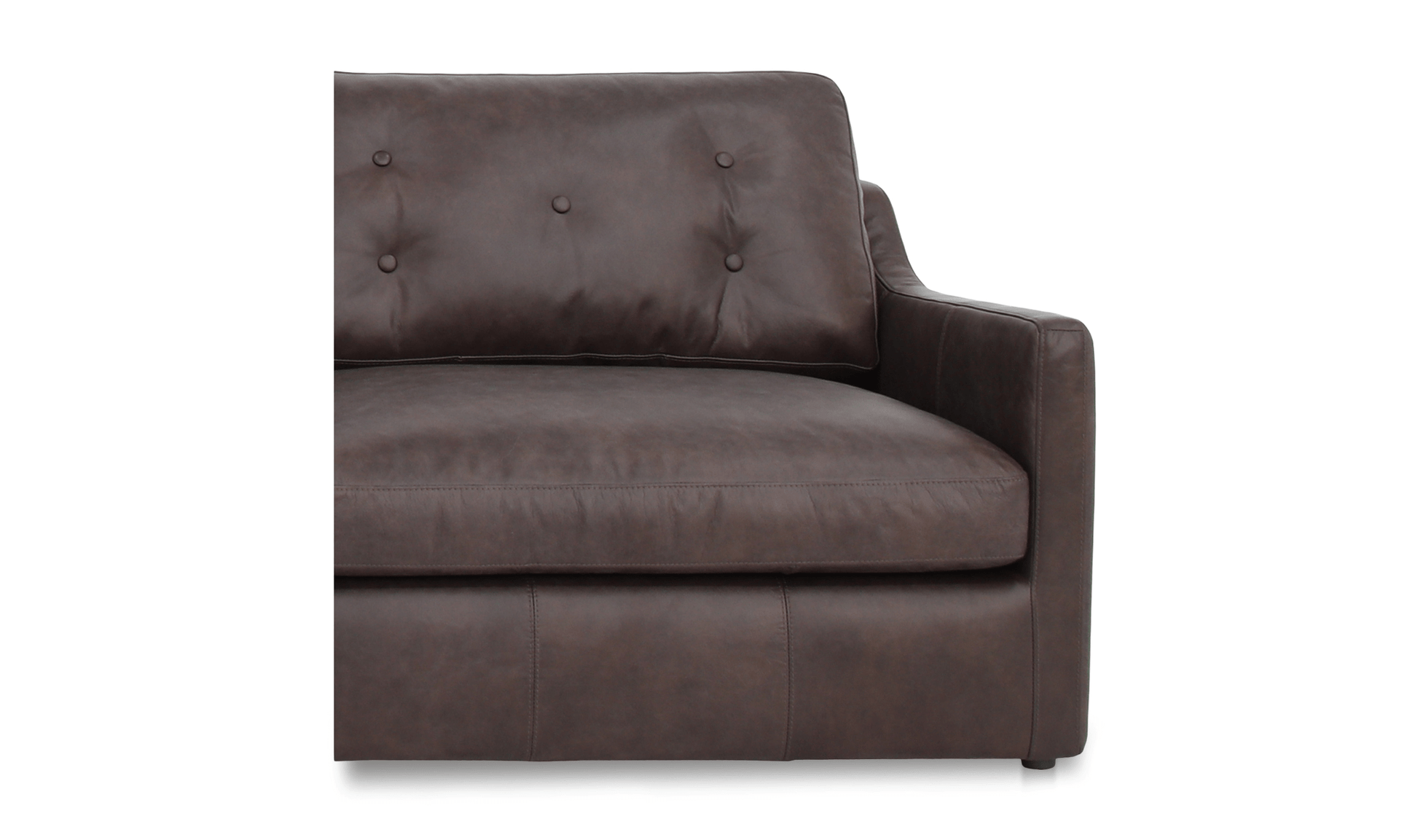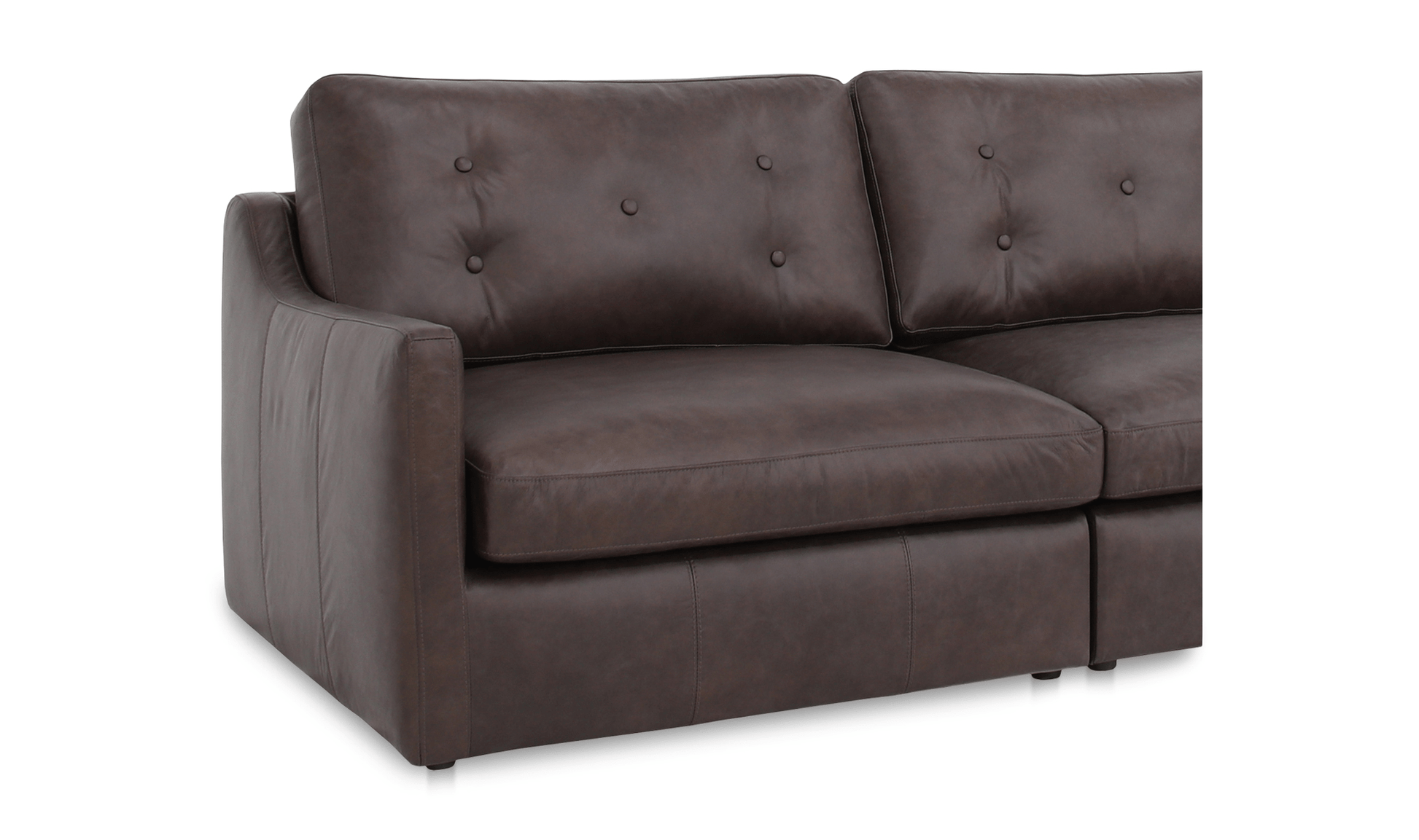 The Thurlow modular sectional collection features sophisticated sloped arms and a tufted back that lends a traditional touch, while its generous proportions and rich espresso hue elegantly balance versatile modernity. Wrapped in top-grain leather, each piece offers plush comfort through unexpected feather and fiber fillings atop high-density foam.