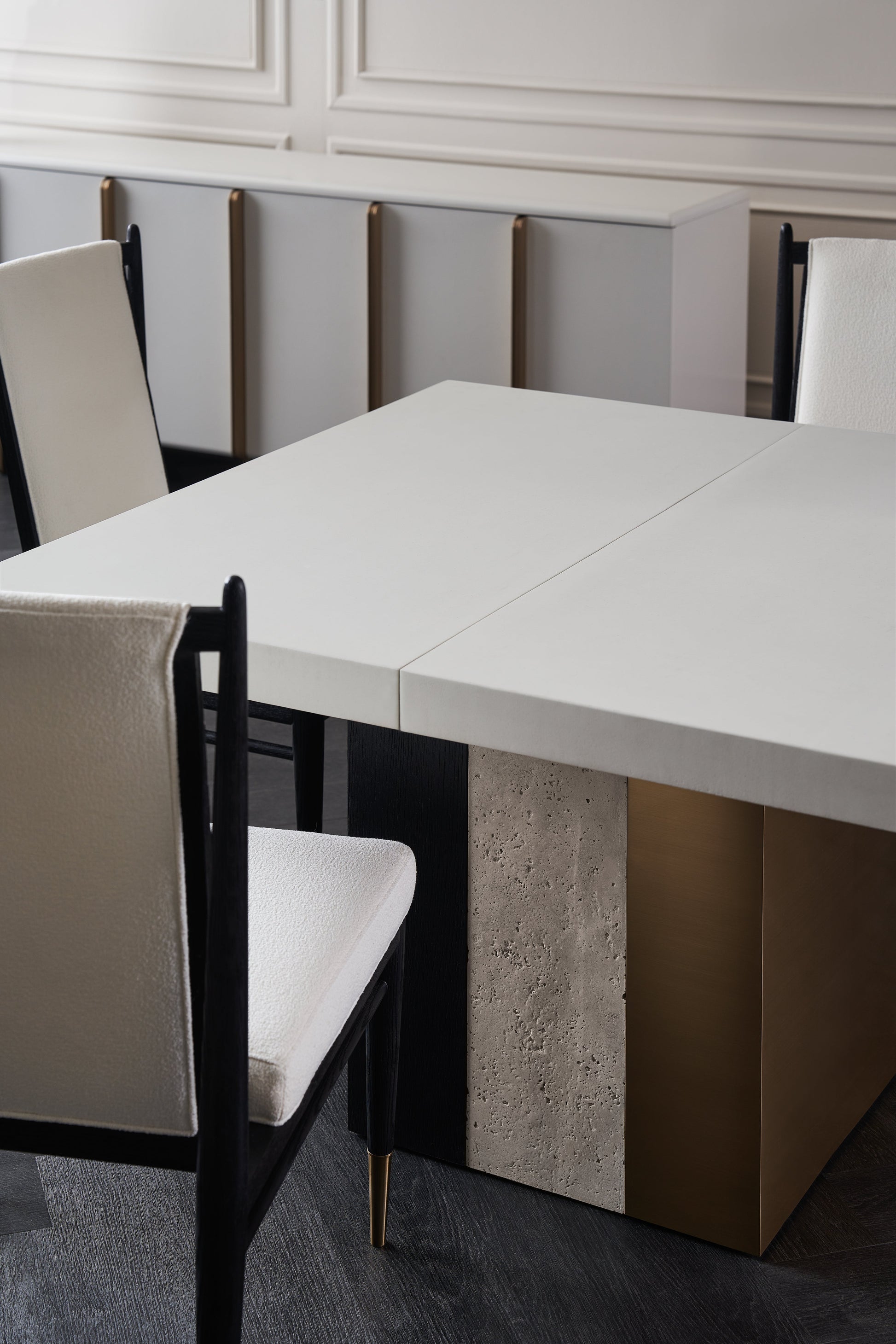 Form and function in perfect harmony: the Unity dark dining table makes a dramatic statement in a unique mix of materials. Architectural lines are punctuated by a tactile top in Burnished Adobe, balanced atop a pillar-style base crafted in travertine stone, Cinder-finished oak and Lucent Bronze Metallic metal. Style as a small pedestal for an intimate dining experience, or expand with two leaves for a larger gathering of guests. Table seats 10 when fully extended.