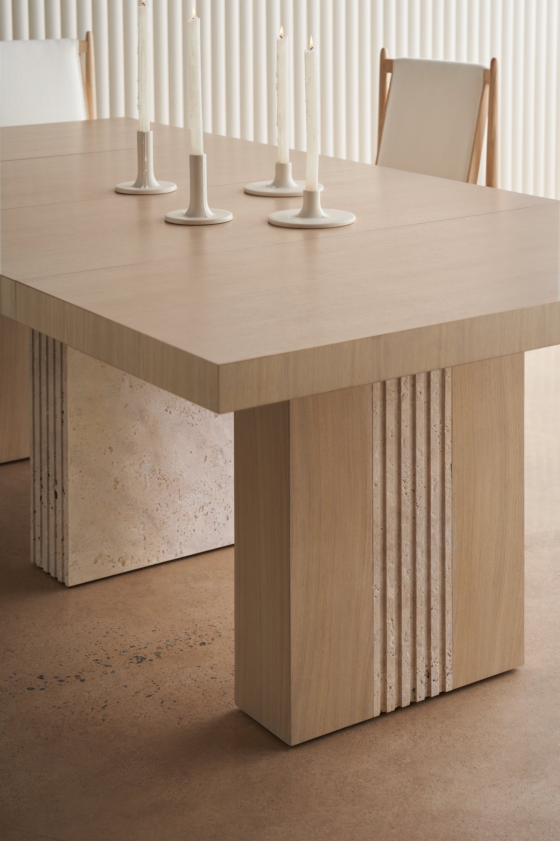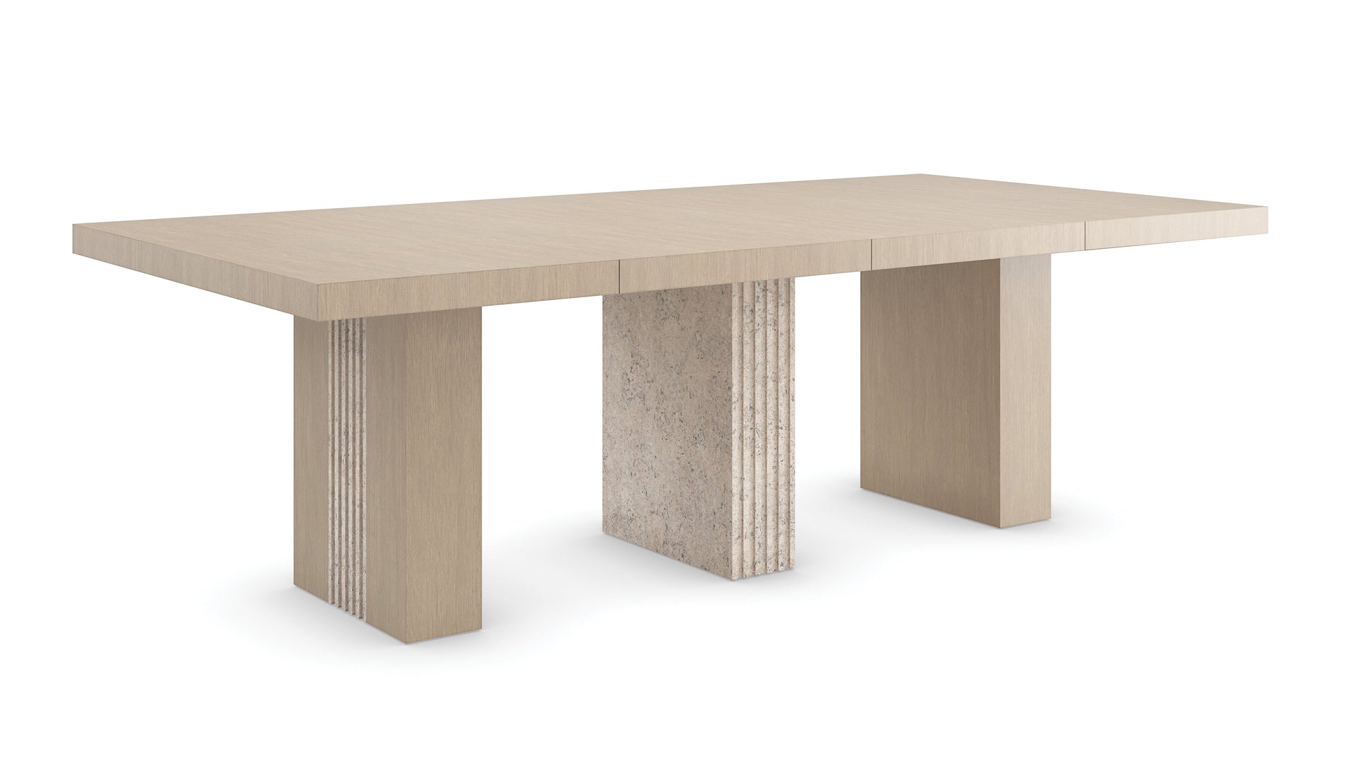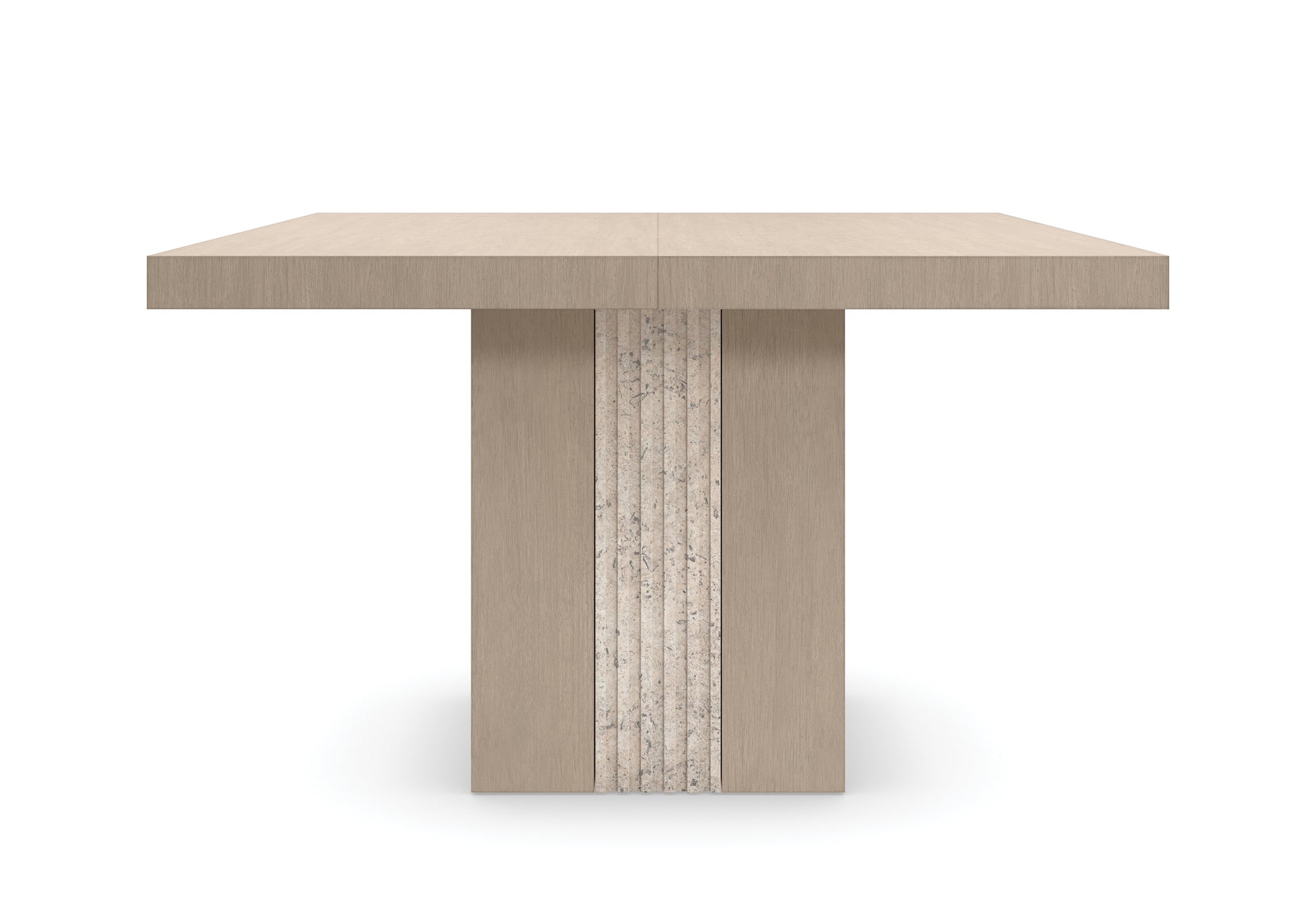 Form and function in perfect harmony: the Unity light dining table celebrates a simple yet intentional use of organic materials. Architectural lines are punctuated by a pillar-style base with hand-carved fluted details in a mix of Sun Drenched Oak and Open Pore Travertine stone. Style as a small pedestal for an intimate dining experience, or expand with two leaves for a larger gathering of guests. Table seats 10 when fully extended.