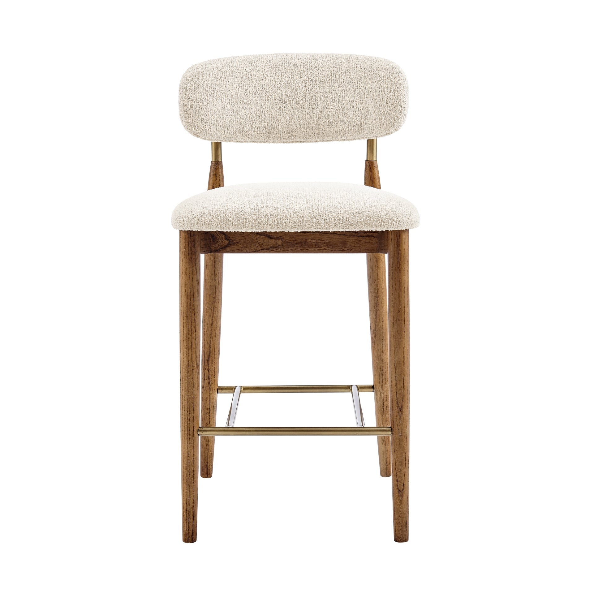 - Classic styling with a refreshing twist! This updated counter stool features a curving backrest and tubular frame in a natural wood tone, embodying a beloved mid-modern style. Charming details like a brass-capped backrest and easy-care fabric for high-traffic residential use add a modern touch to its timeless appeal. The footrest is featured for safety, and plastic glides are included for floor protection.